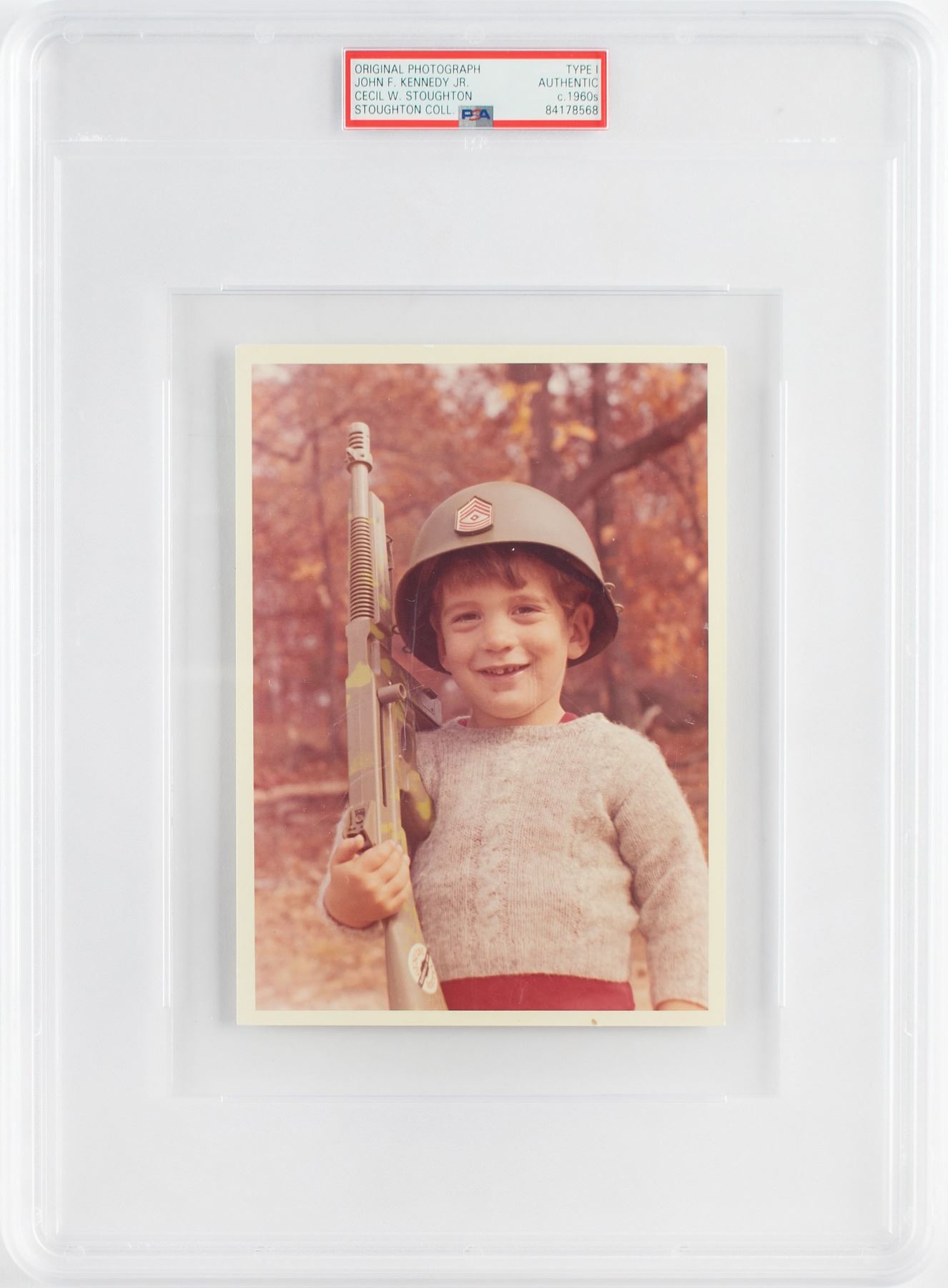 Fantastic original vintage color glossy 5 x 7 photo of John F. Kennedy, Jr., wearing a helmet and holding a toy submachine gun on the grounds of the Kennedy family residence, Wexford, in Atoka, Virginia, taken by official White House photographer Cecil W. Stoughton. Reverse bears "A Kodak Paper" watermarks and a pencil notation, "C387-12.” In fine condition. Encapsulated by PSA as an authentic 'Type I' photograph. Provenance: The Estate of Cecil W. Stoughton, Bonhams.