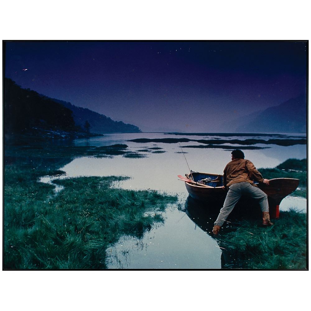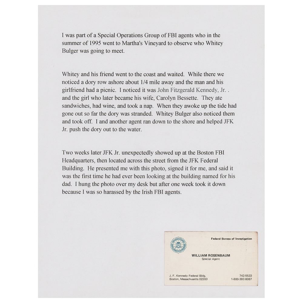 Oversized color photograph of John Jr. on Martha's Vineyard in 1995 taken by the FBI who were on a stakeout for Whitey Bulger and later inscribed by John Kennedy to FBI Special Agent William Rosenbaum, "Bill, thanks for your help, John Kennedy." Provenance: letter of explanation about this photograph from Special Agent William Rosenbaum with his FBI card. Incredible one of a kind FBI surveillance photograph of John Kennedy Jr. Letter and FBI card from Special Agent William Rosenbaum is included and explains the unusual set of circumstances of how and why this photograph was taken in the summer of 1995. The FBI was following up on a tip that Whitey Bulger was meeting somebody of interest to the FBI at Martha's Vineyard and from a distance the FBI spotted a man and a woman who they took pictures of that turned out to be John and his girlfriend and soon to be wife Carolyn Bessette having a picnic. Kennedy inscribed this framed oversized photograph (41" x 31") to Agent Rosenbaum who helped Kennedy push his dory out to the water.