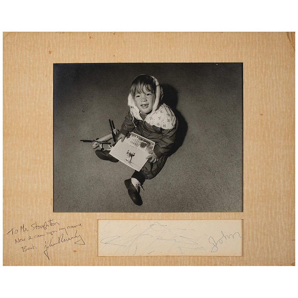 Two historic items: a Cecil Stoughton photograph of young John Jr. with a scribble signature of John Jr. as a 2 year old, later inscribed to Mr. Stoughton from John Kennedy Jr. as an adult, "To Mr. Stoughton, Now I can sign my name, Best, John Kennedy." The charming portrait of young Kennedy showing his first tooth out smile playing with a toy helicopter and a picture of Marine One in the White House. Photo taken by first official White House photographer, Cecil W. Stoughton, who asked the boy to sign his name and hence the below scribble. Stoughton then helped the boy write "John." Some time in the 1990s, Stoughton and John Jr. found themselves at the same table at a NASA event in Florida. Stoughton asked John Jr. to re-inscribe this photo which he graciously did: "To Mr. Stoughton, Now I can sign my name, Best, John Kennedy." Stamped on back by Stoughton. Unique piece from John Jr. who tragically died a few years after signing this photograph. Also includes an original vintage glossy wire service photograph of John Jr. saluting his father during the funeral procession on November 25, 1963.