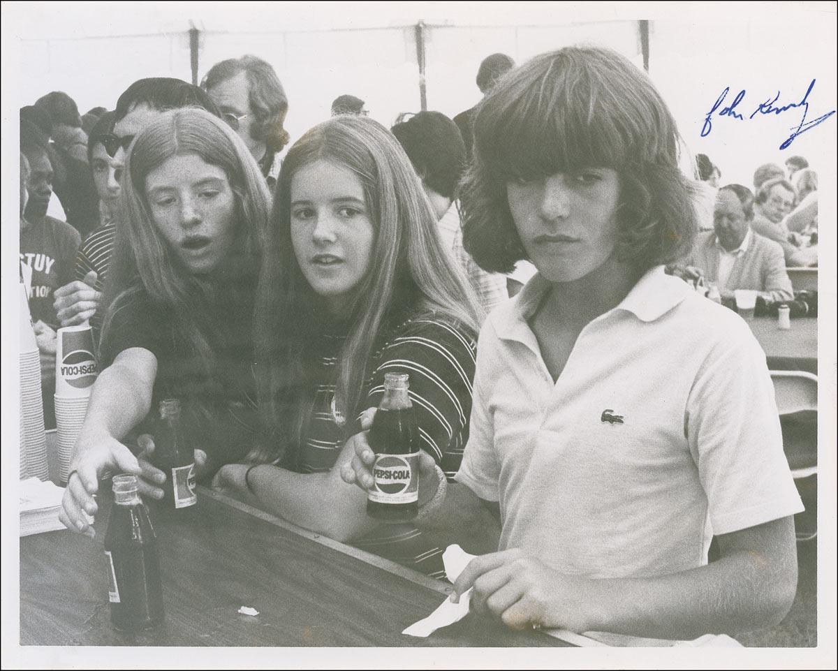 Unique satin-finish 10 x 8 photo of a young John F. Kennedy, Jr. and two friends enjoying bottles of Pepsi, signed in blue ink “John Kennedy.” In fine condition, with some irregular ink adhesion. A most unusual candid portrait.