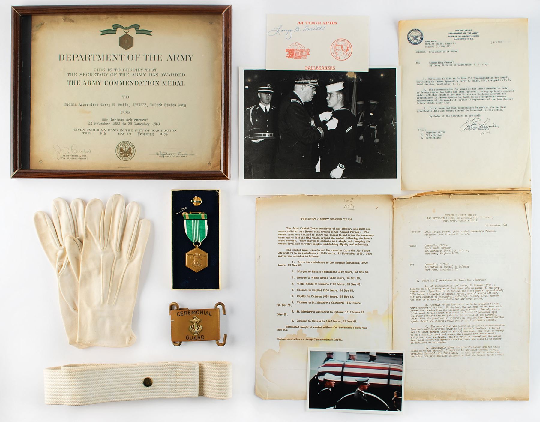 A color glossy 6 x 4 photo of Smith carrying the JFK casket; and a glossy 10 x 8 photo of Smith receiving his Army Commendation Medal. In overall very good to fine condition, with wear and staining to letters and certificate, and expected wear from use to clothing.