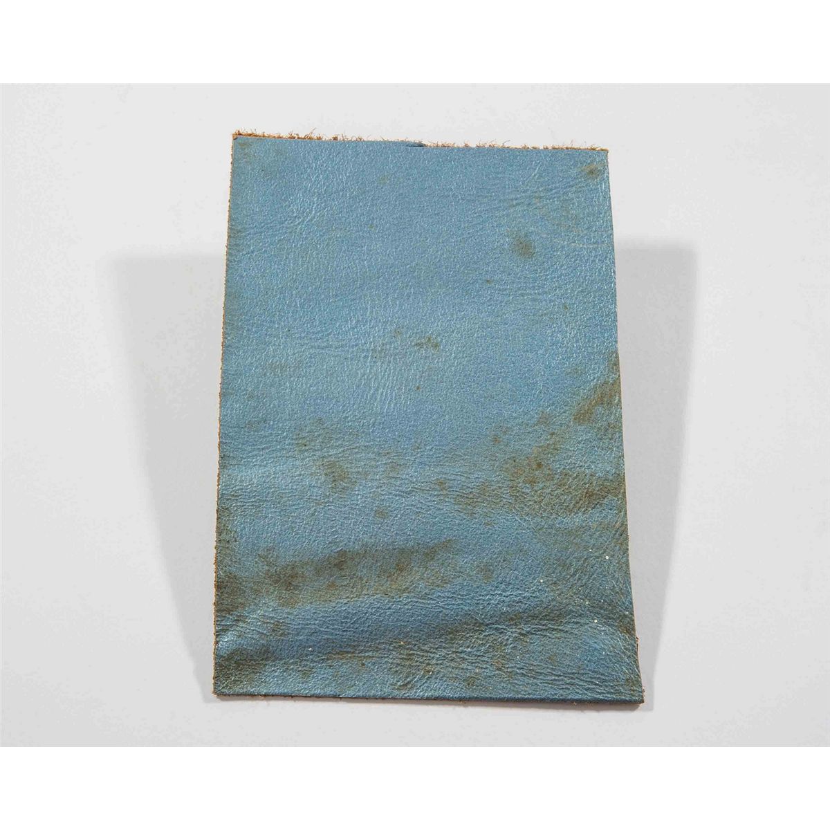 Two swatches of light and dark blue seat leather from the limousine Kennedy was riding in at the time of his assassination, measuring approximately 4.5 x 3 and 4.5 x 2.5. Includes a detailed letter of provenance on White House letterhead from F. Vaughn Ferguson, a technical service representative at the White House whose primary responsibility was the care of the presidential limousine. Important to note that only Mr. Ferguson was permitted continual hands on contact with the 1963 presidential limousine after the tragic assassination of our president. In part: “The leather, light blue and dark blue, is from the automobile in which John F. Kennedy, President of the United States, was Assassinated in, on November 22 1963. Four days after the Assassination the White House upholsterer and I removed this leather at the White House. The light blue leather is from the center of the rear seat. The dark blue leather is from the border of the rear seat. The spots on the leather are the dried blood of our beloved President, John F. Kennedy.” Ferguson was able to retain the removed leather sections, and then the presidential limousine was sent to a Cincinnati firm for refitting and a security upgrade. Mr. Ferguson retained a close relationship with Raleigh DeGeer Amyx over the course of many years, they often spent time visiting at one another’s homes, allowing the gathering of a significant amount of historical information to accompany this relic. A desirable set of both types of leather upholstery in the 1961 Lincoln Continental X-100 presidential limousine and a poignant, historic reminder of that fateful November day. An iconic and seminal offering, related to the final moments of our martyred president’s life.