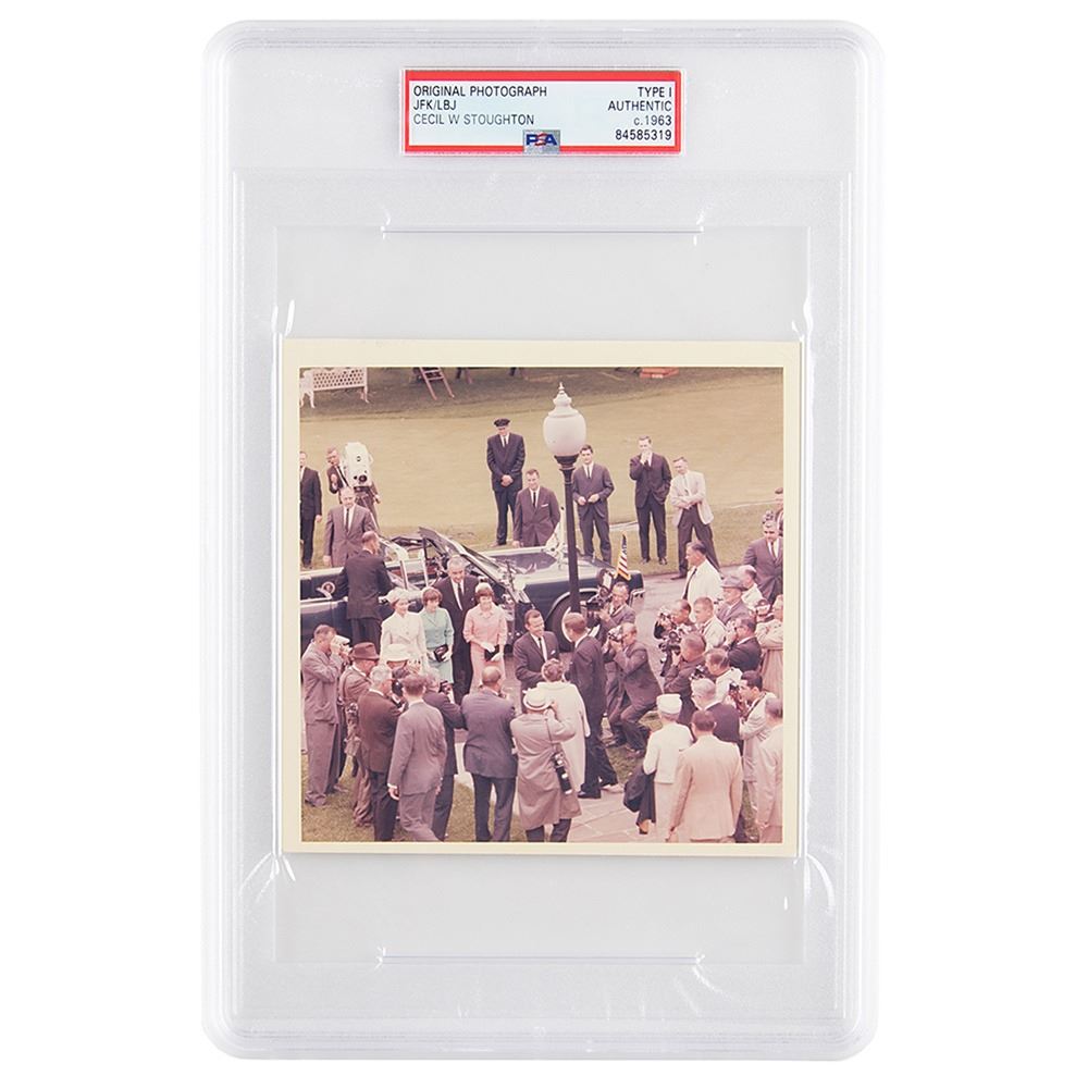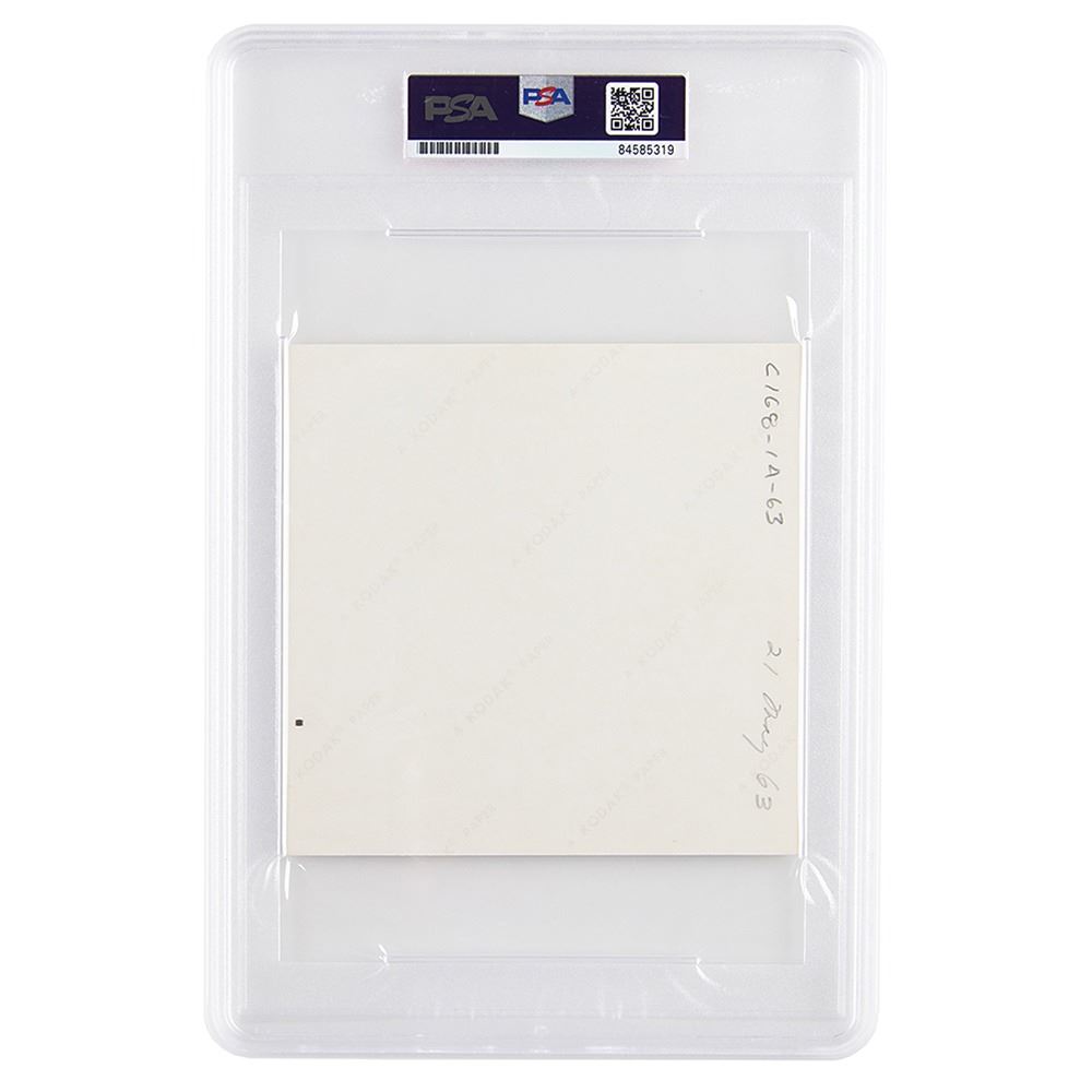 Original vintage color glossy 5 x 5 photo of President John F. Kennedy shaking hands with Mercury astronaut Gordon Cooper on May 21, 1963, with Vice President Lyndon B. Johnson pictured nearby. This photo was taken by official White House photographer Cecil W. Stoughton on the day President Kennedy presented Cooper with the NASA Distinguished Service Medal. The reverse bears “A Kodak Paper†watermarks and is annotated with the negative number, “C168-1A-63†and the date, “21 May 63.†In fine condition. Encapsulated by PSA as an authentic 'Type I' photograph.