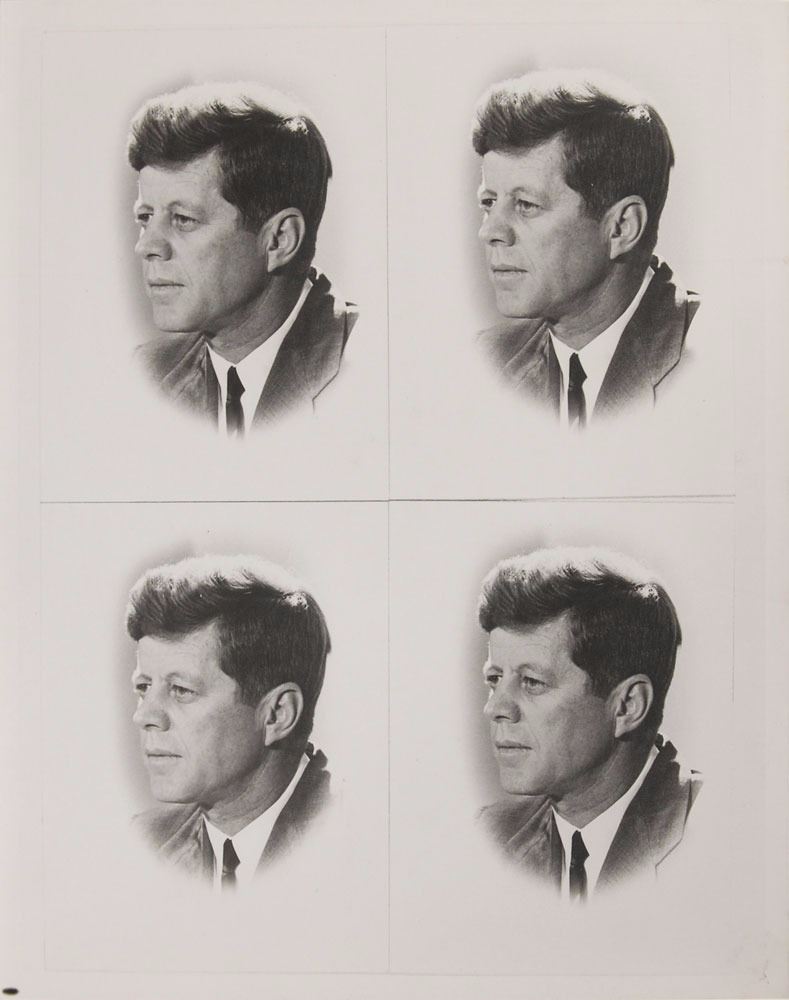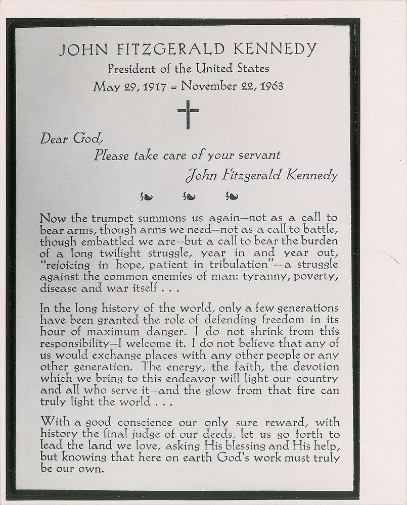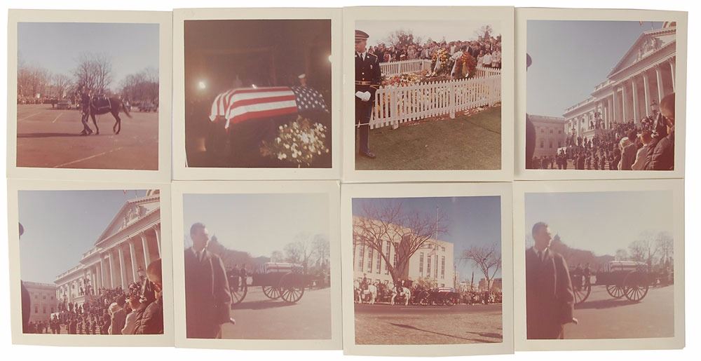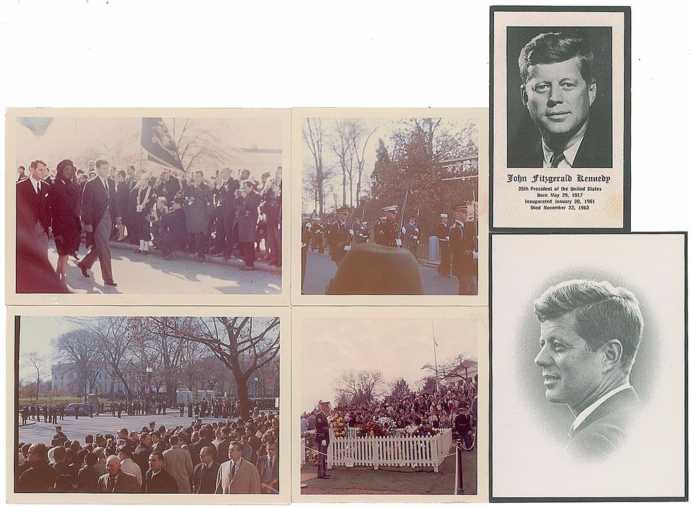 Collection of John F. Kennedy memorial items, including: ten original color glossy 3.5 x 3.5 candid photos taken at the funeral held for JFK in Washington, DC, with subjects including the procession of the horse-drawn caisson carrying his flag-draped coffin, the coffin in the Capitol rotunda, crowds outside the Capitol, and the ceremony at Arlington National Cemetery; two color 5 x 3.5 candid photos of the same proceedings; an uncut sheet of four rare JFK prayer cards (which type was not ultimately used during the Kennedy memorial services), 8 x 10, from the estate of his longtime secretary Evelyn Lincoln; a 3.5 x 4.75 prayer card honoring the fallen president; a 2.5 x 4 commercially produced variant of a JFK prayer card; and two matte-finish 8 x 10 photos of both sides of a prayer card for a rejected design, from the estate of Assistant White House Press Secretary Malcolm Kilduff. In overall fine condition.