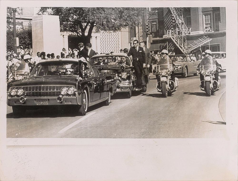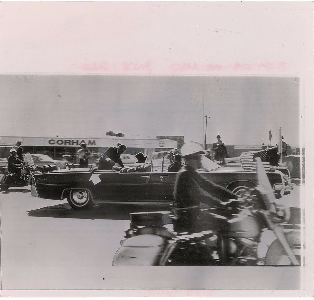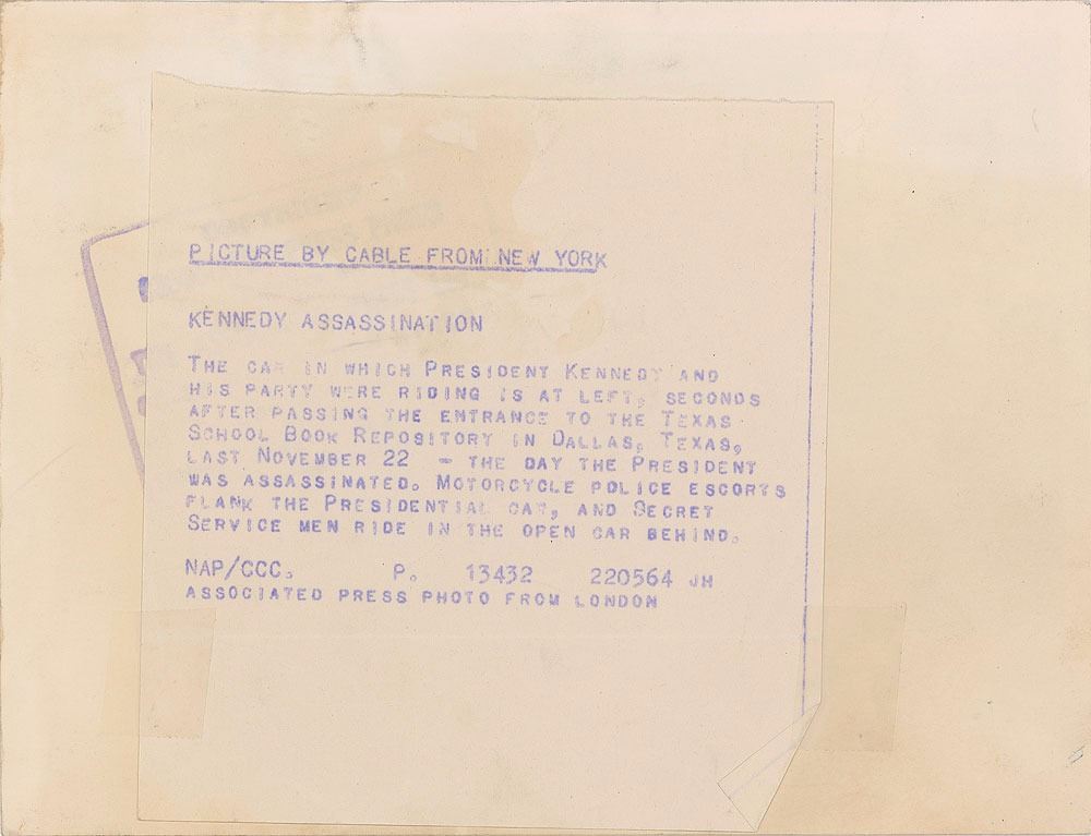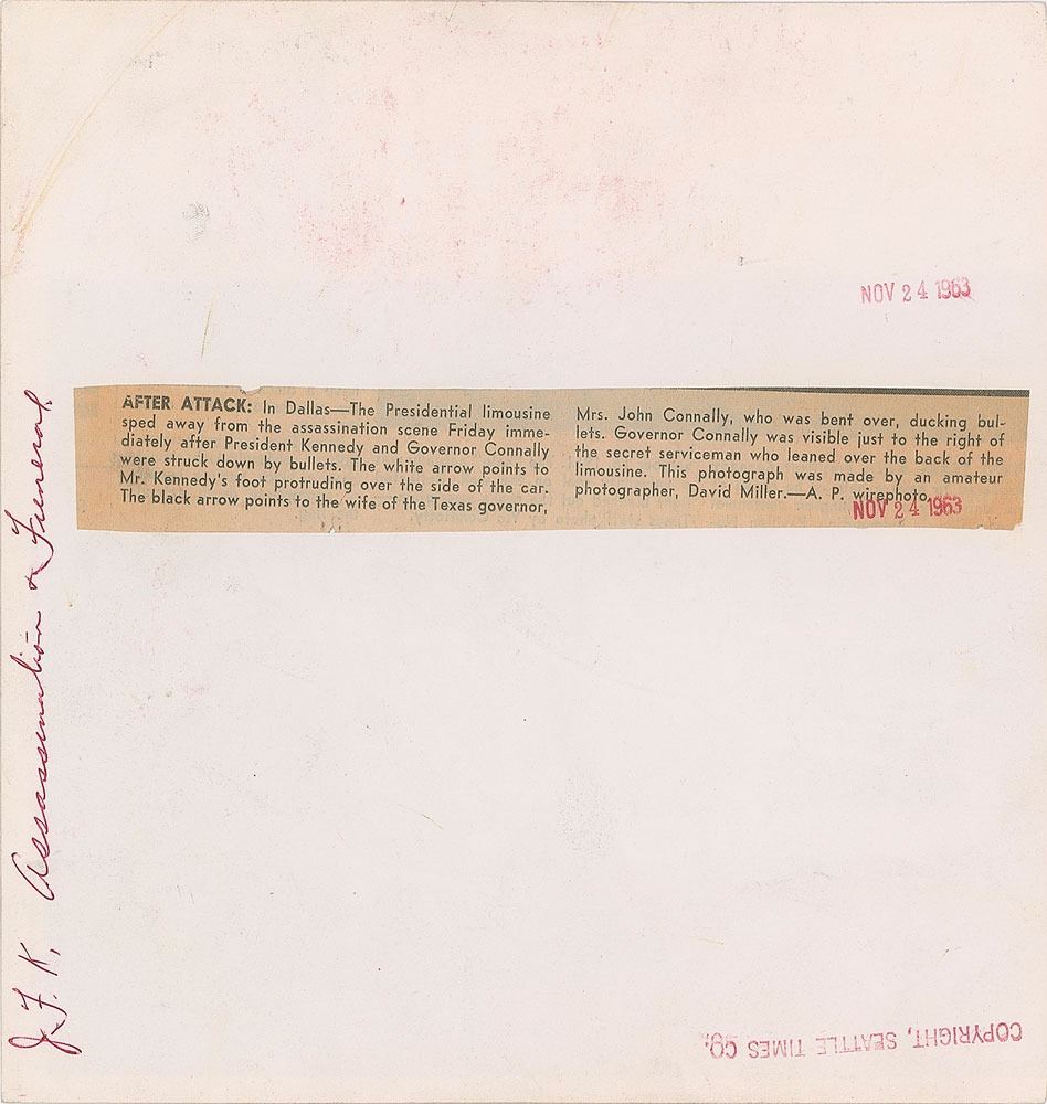 Two original vintage press photos of JFK's Dallas motorcade: a glossy 8 x 6 photo of the motorcade passing the entrance to the Texas School Book Repository moments before the assassination, bearing an affixed caption on the reverse; and a glossy 8.25 x 8 photo showing the presidential limousine speeding away after JFK was shot, stamp-dated November 24, 1963, bearing a Seattle Times copyright stamp and affixed newspaper caption on the reverse. In overall very good to fine condition, with scattered creasing and surface impressions.