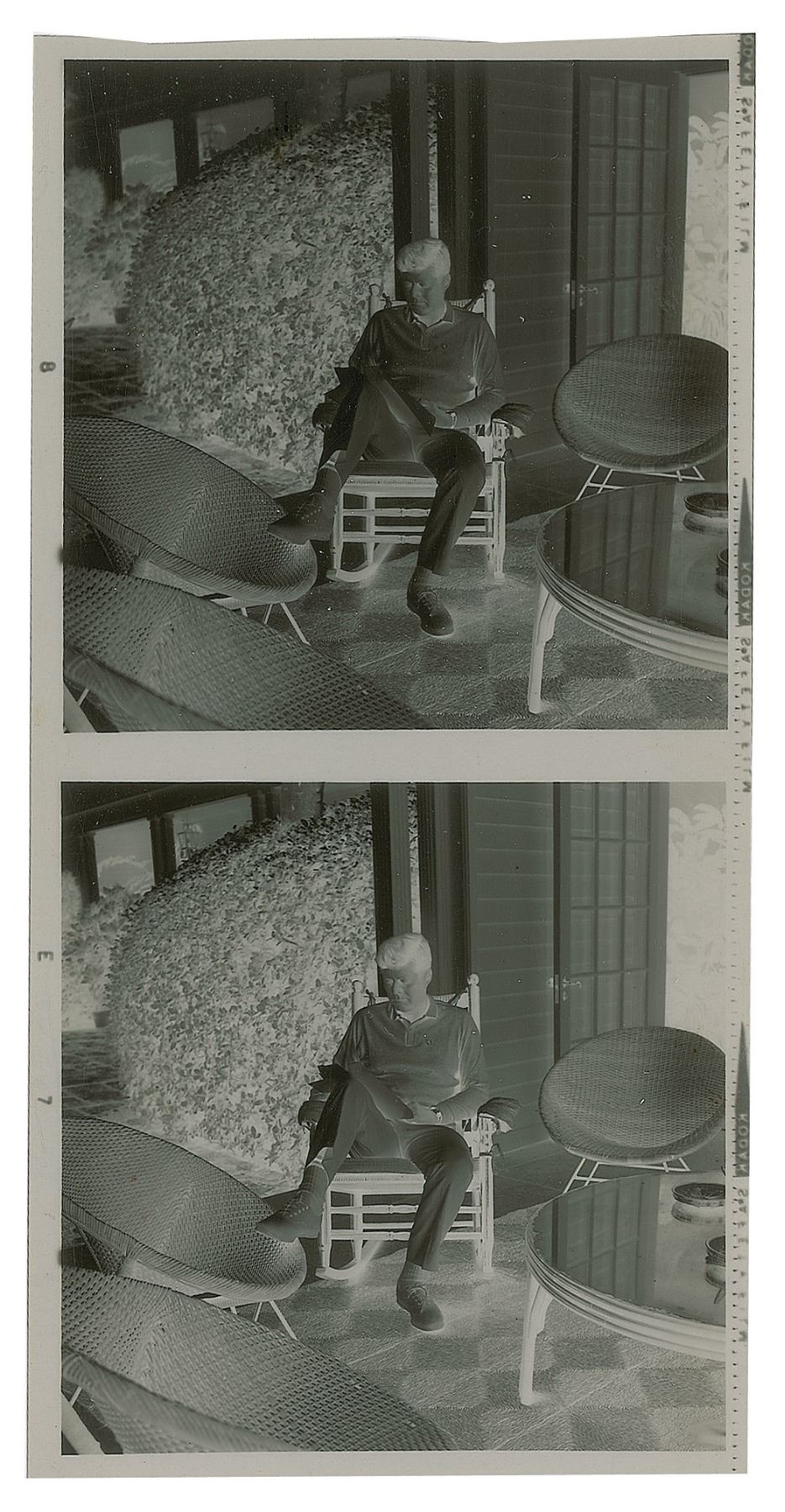 Remarkable assortment of 19 original negatives of President John F. Kennedy at the ‘Winter White House,’ the Kennedys Palm Beach residency at 1095 N. Ocean Boulevard, in December 1962 and January 1963. The images were taken by photographer Eddie Johnson, who traveled to the Floridian getaway as the personal assistant of Elaine de Kooning, a celebrated portrait artist recently commissioned to paint President Kennedy’s official portrait for the Truman Library.