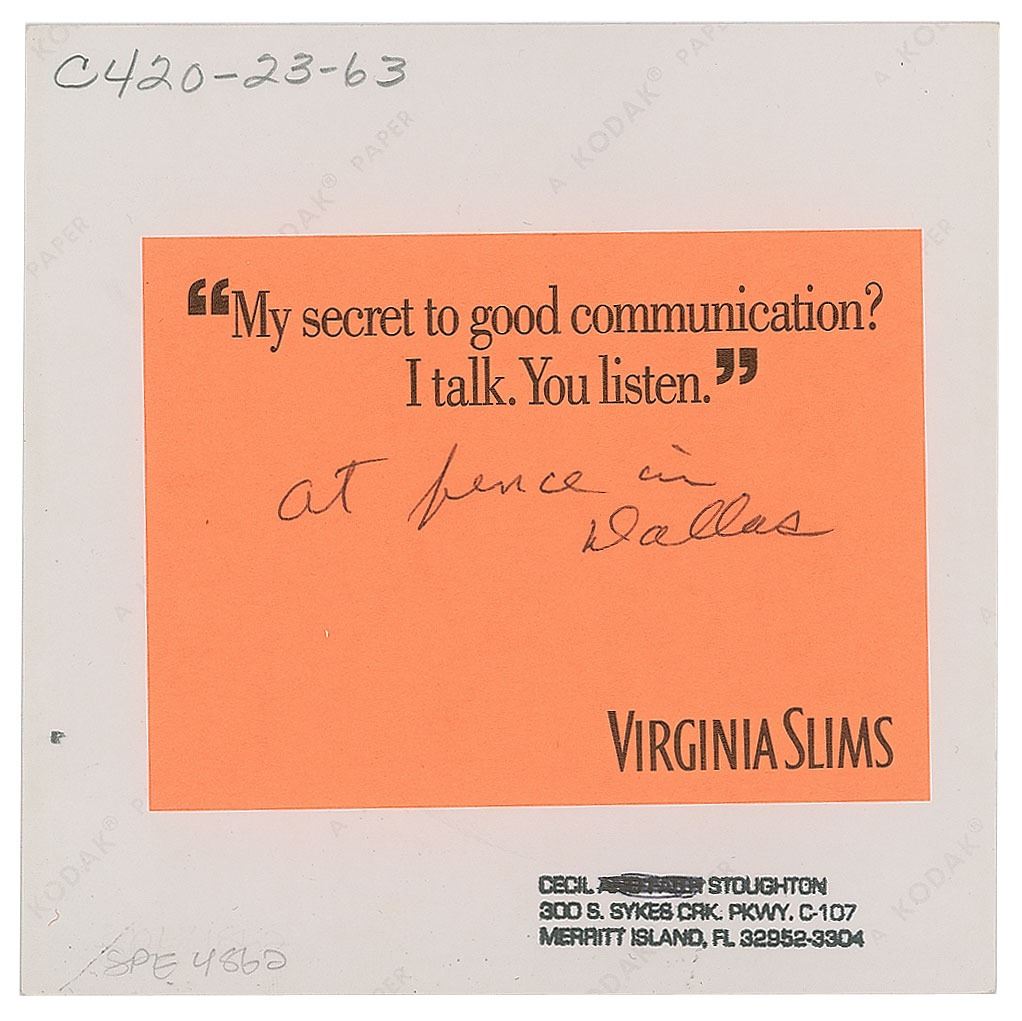 Cecil Stoughton's own original vintage color glossy 5 x 5 photo of John F. Kennedy and Jacqueline Kennedy in Texas on the morning of the assassination, taken by official White House photographer Cecil W. Stoughton on November 22, 1963. The president and first lady—dressed in her iconic pink Chanel suit—are seen with their secret service detail as they pass an adoring crowd. Reverse bears "A Kodak Paper" watermarks and pencil notations, "C420-23-63," as well as Stoughton's stamped return address and an affixed sticky note annotated in Stoughton's hand, "at fence in Dallas." In very fine condition. From the collection of Cecil W. Stoughton.