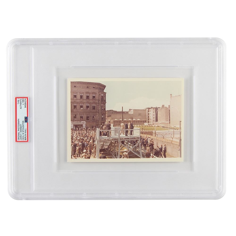 Original vintage color glossy 7 x 5 photo of President John F. Kennedy standing on a platform overlooking the Berlin Wall during his visit to West Berlin on June 26, 1963, taken by official White House photographer Cecil W. Stoughton. The reverse bears “A Kodak Paper†watermarks and is annotated with the negative number, “C230-23-63.†In fine condition, with small creases to the lower left corner. Encapsulated by PSA as an authentic 'Type I' photograph.