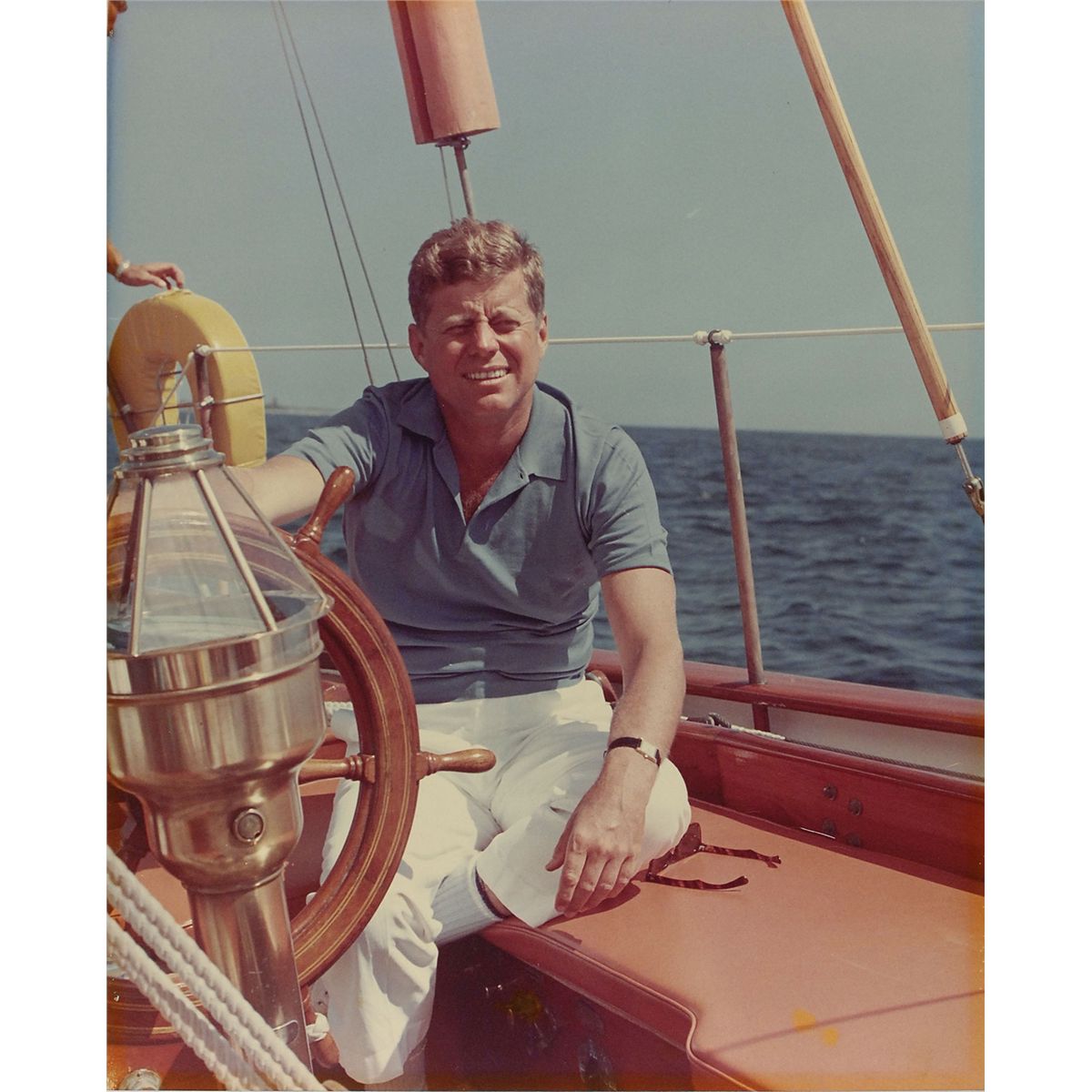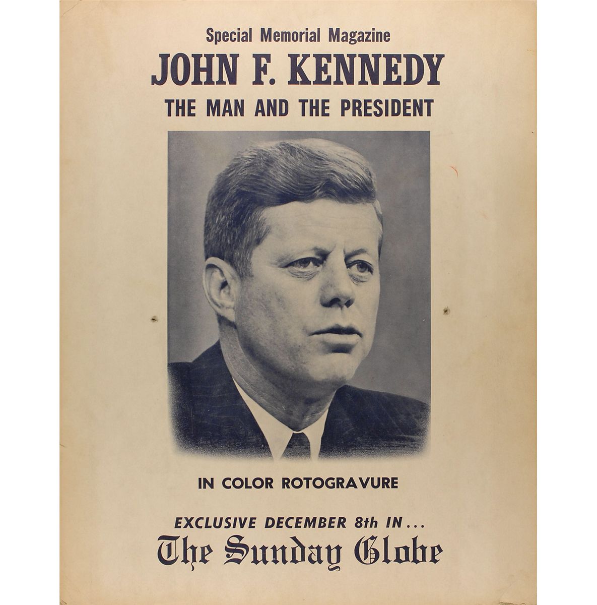 Two items: original 22 x 28 newspaper stand placard featuring the slain president’s portrait advertising their exclusive memorial magazine to be included with the December 8 [1963] issue of The Sunday [Boston] Globe; and an unsigned color satin-finish 16 x 20 photo of Kennedy at the helm of his sailboat. In very good condition, with two mounting holes and scattered soiling to placard and rippling and spotting to photo.