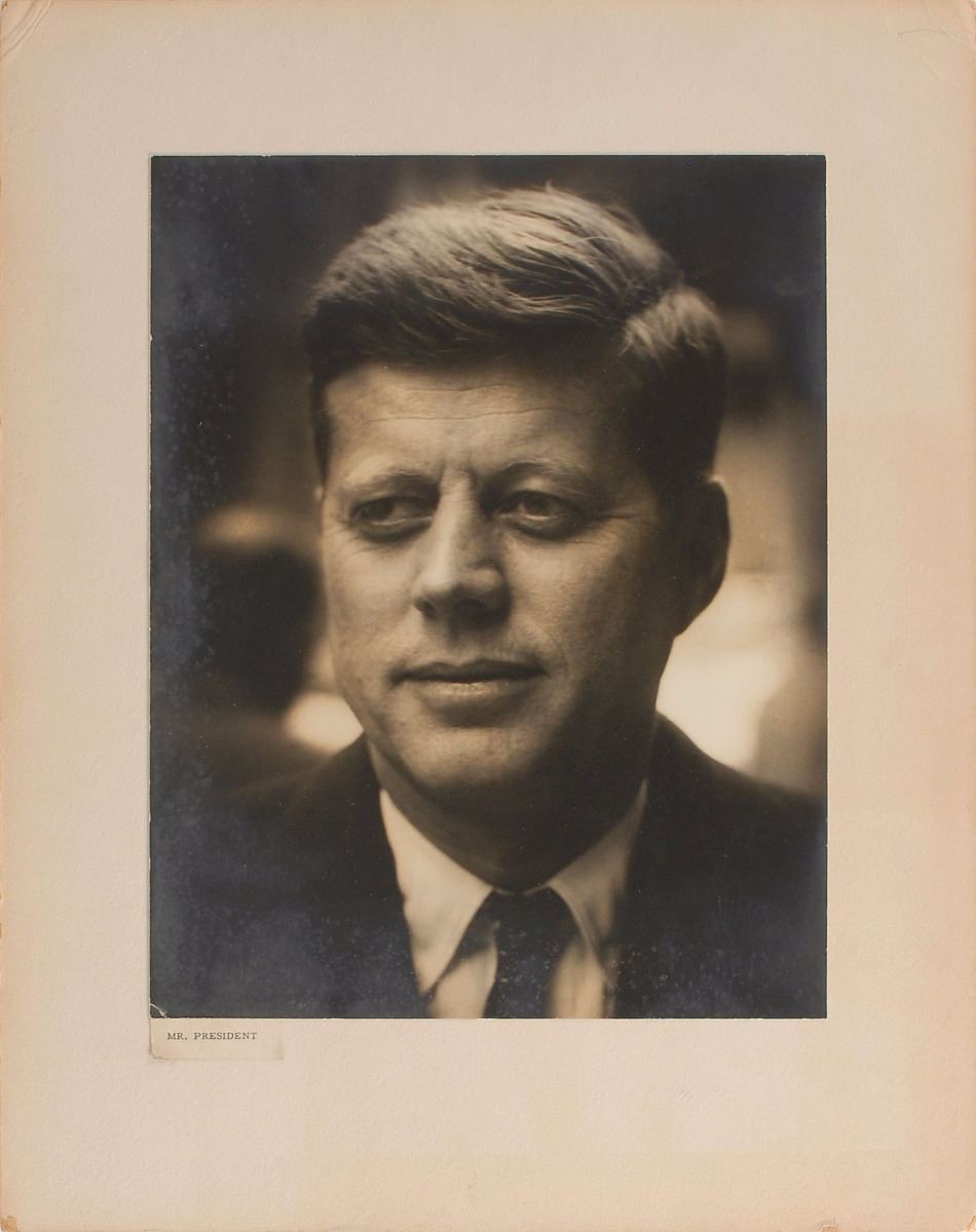 Magnificent original matte-finish 11 x 14 close-up photo of President Kennedy aptly portraying his distinctive visage affixed to its original mount, with a small “Mr. President” tag affixed to the lower left. In fine condition, with mild silvering mainly confined to background.