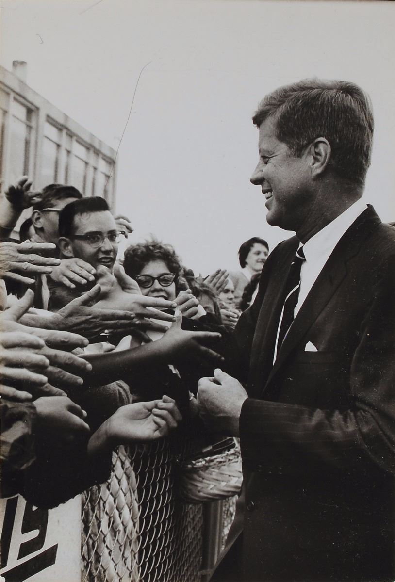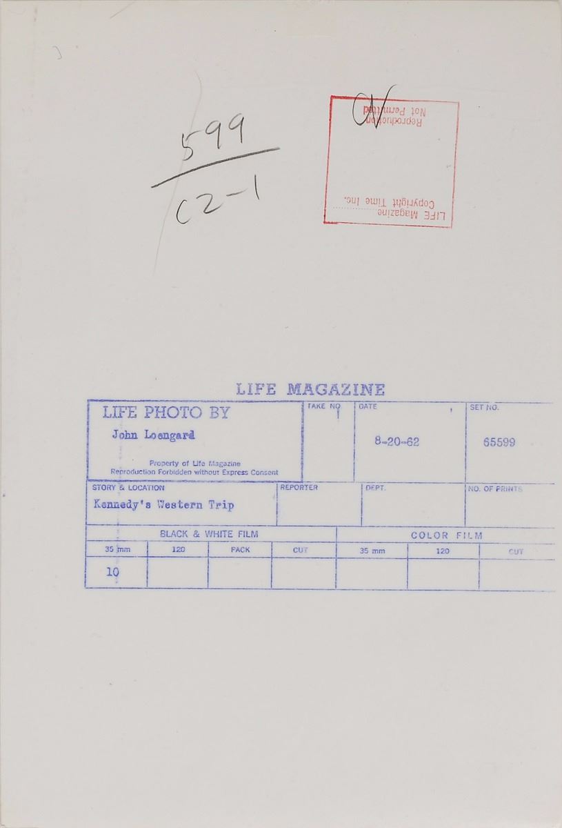Fantastic original semi-glossy 8.75 x 13 photo of Kennedy shaking hands with supporters while on a trip out west, taken by Life magazine photographer John Loengard on August 20, 1962. Reverse bears Life magazine copyright stamps. In fine condition. Accompanied by a white mat for display.