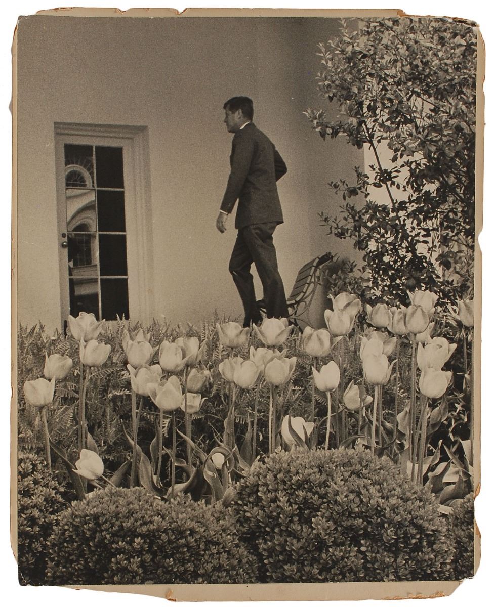 Huge original matte-finish 15.5 x 19 photo of President Kennedy with the White House Rose Garden in the foreground, affixed to its original mount. In very good condition, with heavy chipping to fragile edges of the mount and a slightly grainy quality to the image. This wonderful image was captured on May 1, 1963, when Kennedy was returning to the Oval Office after a meeting with Army leaders; from the artistic angle, it appears as though he is walking on a bed of to the upper tulips. A superb, visually appealing piece.