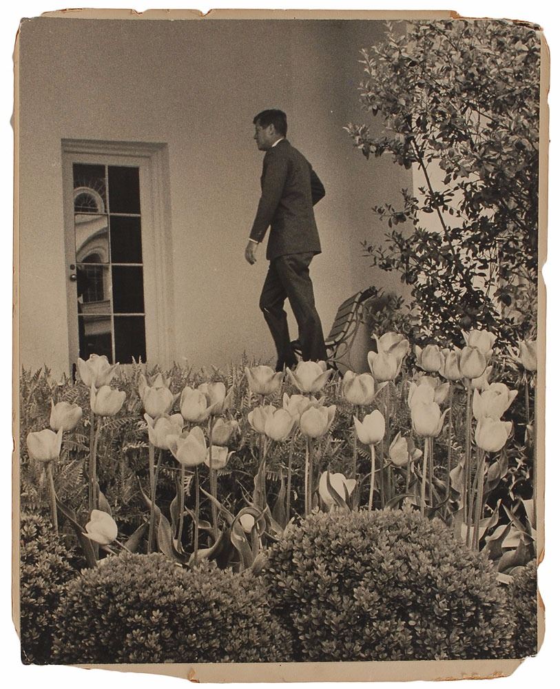 Huge original matte-finish 15.5 x 19 photo of President Kennedy with the White House Rose Garden in the foreground, affixed to its original mount. In very good condition, with heavy chipping to fragile edges of the mount and a slightly grainy quality to the image. This wonderful image was captured on May 1, 1963, when Kennedy was returning to the Oval Office after a meeting with Army leaders; from the artistic angle, it appears as though he is walking on a bed of to the upper tulips. A superb, visually appealing piece.