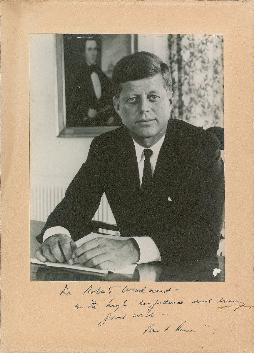 Classic matte-finish 7.5 x 9.5 portrait of President Kennedy affixed to its original 9.75 x 13.5 mount, signed and inscribed on the mount in fountain pen as president, “To Robert Woodward—with high confidence and every good wish—John F. Kennedy.” In very good to fine condition, with a thin horizontal stain touching one word of the sentiment, two small areas of missing emulsion to the edges of the image, and light irregular toning to the trimmed mount. Woodward was a career American diplomat who focused on international relations with various countries in Latin America. He had been ambassador to Uruguay for three years when Kennedy took office and JFK soon named him ambassador to Chile, a position he held for just three months. In the wake of the failed Bay of Pigs invasion, Woodward was made Assistant Secretary of State for Inter-American Affairs, serving for a year before becoming ambassador to Spain. A superb association with international relations during the Kennedy presidency.