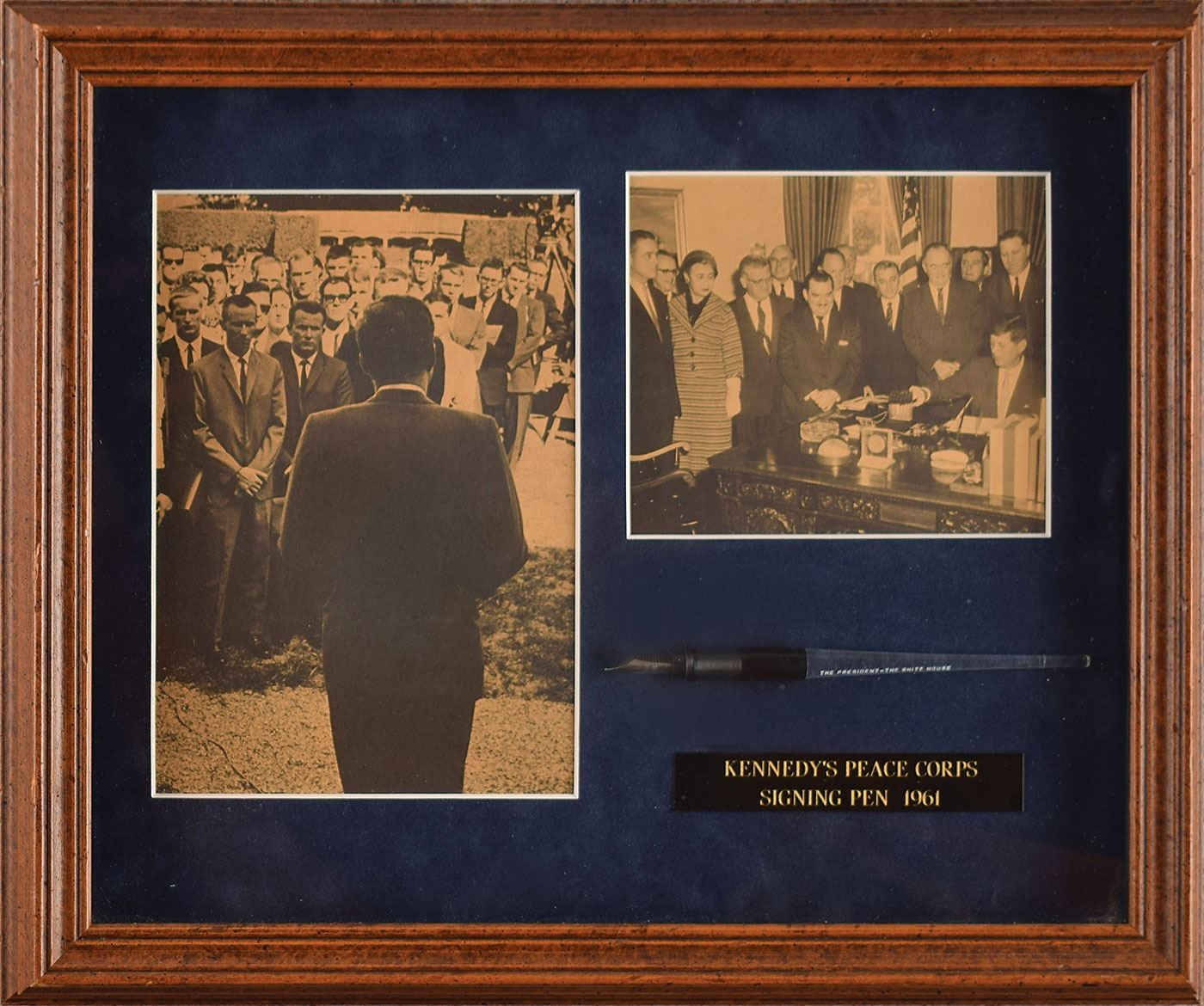 President Kennedy's dipping pen used to sign the bill establishing the Peace Corps. Executive Order 10924 was signed on March 1, 1961, directing the State Department to establish a temporary Peace Corps. Later that year on September 22, 1961, the Peace Corps Act was enacted. The official 'bill signer' Esterbrook pen measures 6.25? long and features a black plastic grip with a Lucite handle imprinted with "The President—The White House." The steel nib bears signs of use. Cloth shadowboxed and framed with two photos of Kennedy, including one of him at his desk, to an overall size of 15.5 x 13. In fine condition.