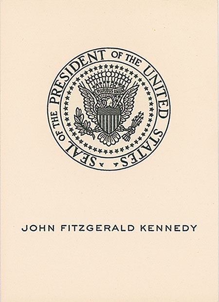 Personalized bookplate for President John F. Kennedy, designed and crafted during his time in the White House. The bookplate measures 3.25 x 4.5 and features an embossed presidential seal with his full name below, "John Fitzgerald Kennedy." In very fine condition.