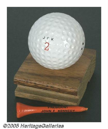 <B>John F. Kennedy Personalized Golf Ball and Tee</B></I> When President Kennedy wasn't worrying about Cuban missiles or the other woes of his office, he would sometimes drive golf balls on the South Lawn of the White House. Melvon Carter, General Foreman of the White House maintenance crew, picked up this personalized golf ball, marked "JFK 2," on the lawn one day as well as a "President John F. Kennedy" inscribed golf tee. A long historical one-page typed signed letter from Carter's widow on White House Stationery documents the items as well as provides anecdotes about White House life. JFK never ever used golf balls as gifts. He owned and used what few personalized golf balls that exist. Lot:255