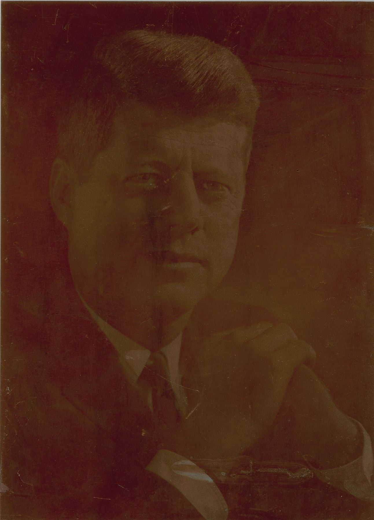 Printing plate featuring a portrait of President John F. Kennedy with his hands clasped, measuring 8 x 11.25. In very good to fine condition, with light scratching and scuffing.
