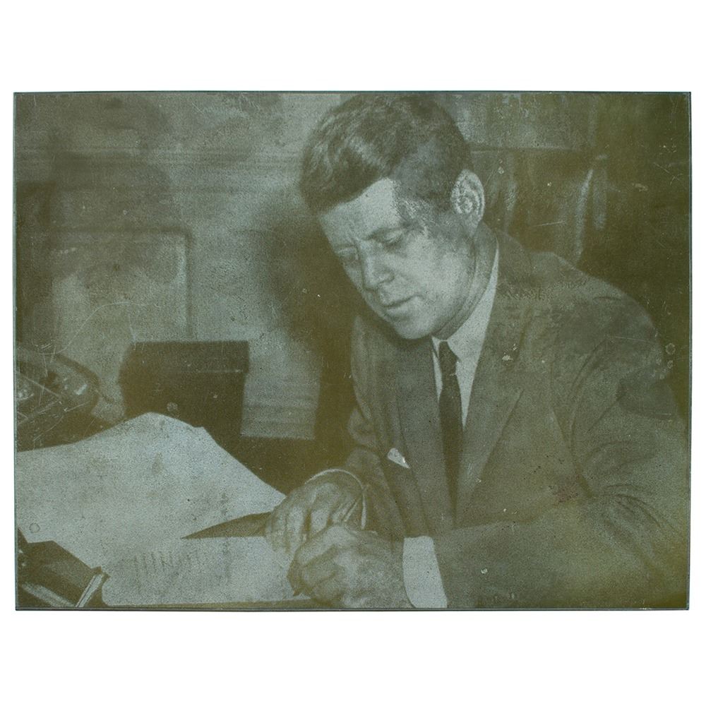 Printing plate featuring an image of President John F. Kennedy signing a document, measuring 9.75 x 7.5. In very good to fine condition, with some scratching and scuffing.