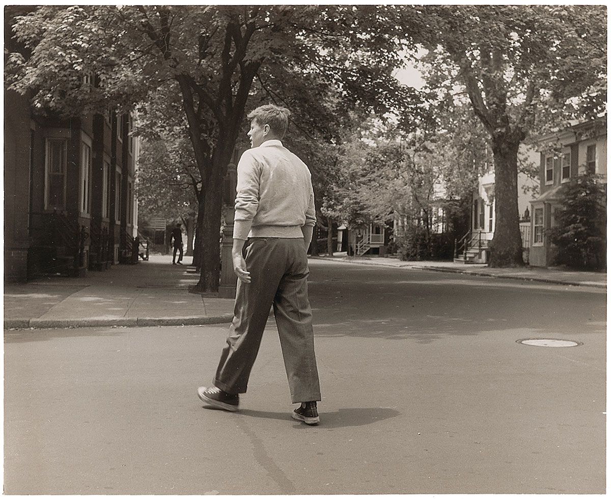 Original first-generation 9.75 x 8 glossy photo of John Kennedy, dressed casually and wearing a pair of Chuck Taylor hightops, crossing a street in Georgetown. Reverse of photo bears a Three Lions Inc. stamp. In fine condition.