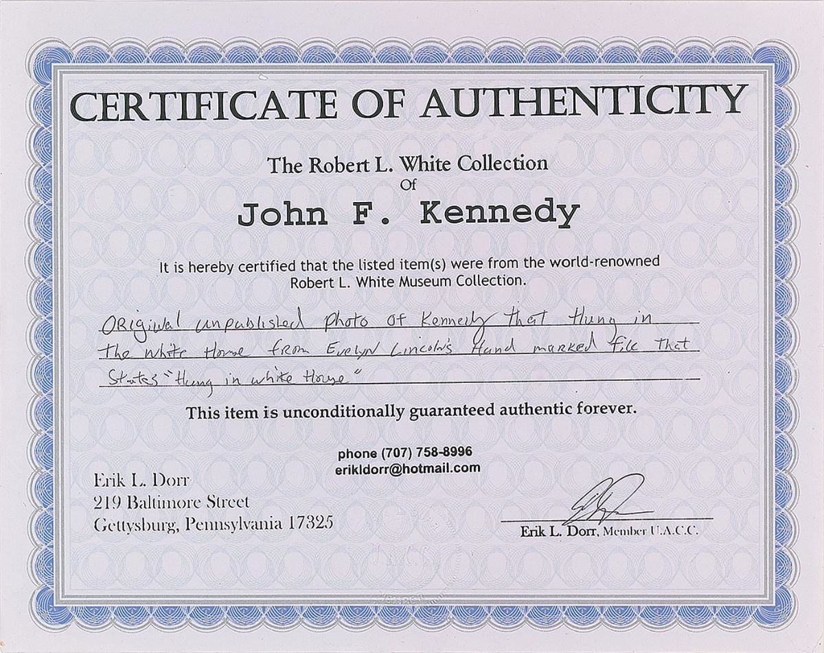 Fantastic official glossy 7.5 x 9.5 photo of President Kennedy reading what appears to be an official transcript of one of his speeches, once hung in the White House by his longtime secretary Evelyn Lincoln. Presented in its original mat. In fine condition. Provenance: The Robert L. White Collection. Accompanied by a certificate of authenticity from Erik L. Dorr stating that this came from a folder in Evelyn Lincoln’s filed marked ‘Hung in White House’; whenever official White House photographer Cecil Stoughton brought Lincoln new photos she chose one to hang up in her office.