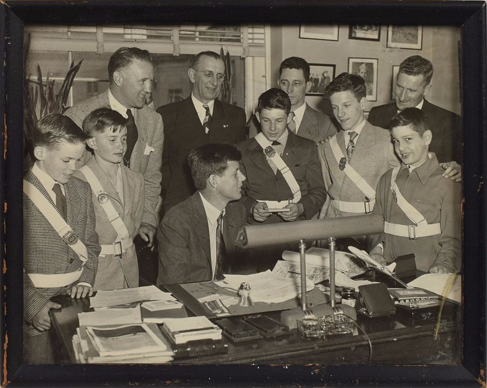 Original vintage glossy 9.25 x 7.25 photo of Congressman Kennedy meeting with Boy Scouts in his Boston office. Framed and in very good to fine condition, with light creasing and crazing to the emulsion. From the collection of JFK's research assistant, Deirdre Henderson, who states that she believes this to be the only example of this photograph in existence. Accompanied by a letter of provenance from Henderson.