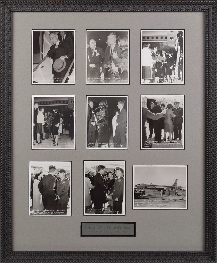 Group of nine vintage glossy crystal-clear Air Force photos with inherent captions, all 3.5 x 4.75, showing Kennedy at Carswell Air Force Base in Fort Worth, Texas, on November 21st and 22nd, 1963. The images show President John F. Kennedy, First Lady Jacqueline Kennedy, Vice President Lyndon B. Johnson and their party on the tarmac at the base. The final images show Kennedy about one hour and thirty minutes before he was assassinated, and Air Force One as it departed from Carswell. Nicely matted and framed to an overall size of 19 x 23. In overall fine condition.
