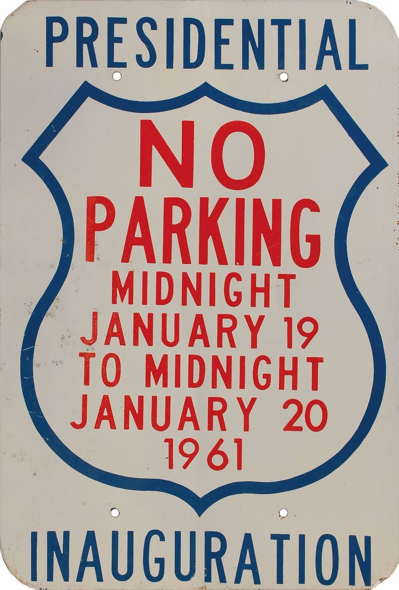 A metal 12 x 18 street sign used in Washington, DC, on the day of JFK’s inauguration, reading, “Presidential Inauguration, No Parking, Midnight, January 19, to Midnight, January 20, 1961.” In fine condition. Accompanied by a letter of provenance, in part: “As a college student at the University of Maryland in 1961, I went to President John F. Kennedy’s inauguration parade…As we started back to College Park, MD. I noticed a metal red, white and blue ‘No Parking, Presidential Inauguration’ sign dangling sideways on a metal wire attached to a telephone pole not far from the White House…I shoved it under my overcoat and took it back to my campus college room as a souvenir.”