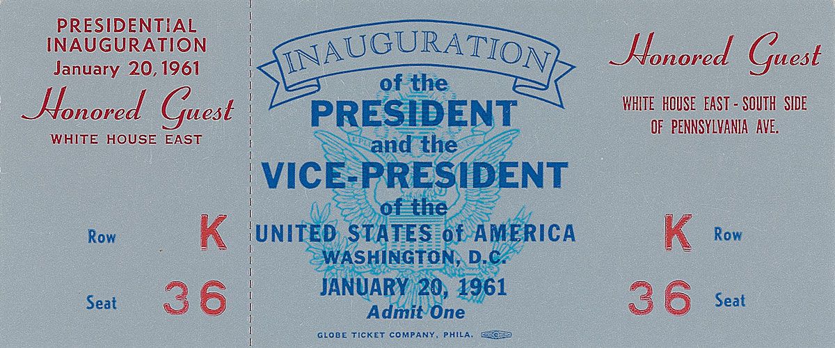 Original unused ticket to Kennedy’s inauguration, 6 x 2.5, held on January 20, 1961. Silver ticket is issued for an “Honored Guest,” holding a reserved seat. In fine condition.