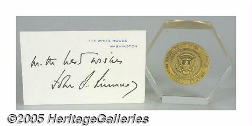 <B>John F. Kennedy Presidential Paperweight with Presentation Card</B></I> Very few White House gift Items were issued during the Kennedy years, and here is a great opportunity to own a piece from the Kennedy White House. This 2 5/8" paperweight has the Presidential Seal imbedded in the lucite. The item comes with the presentation card that reads, "With Best Wishes John F. Kennedy." The item comes in what is believed to be the original box. Lot:264