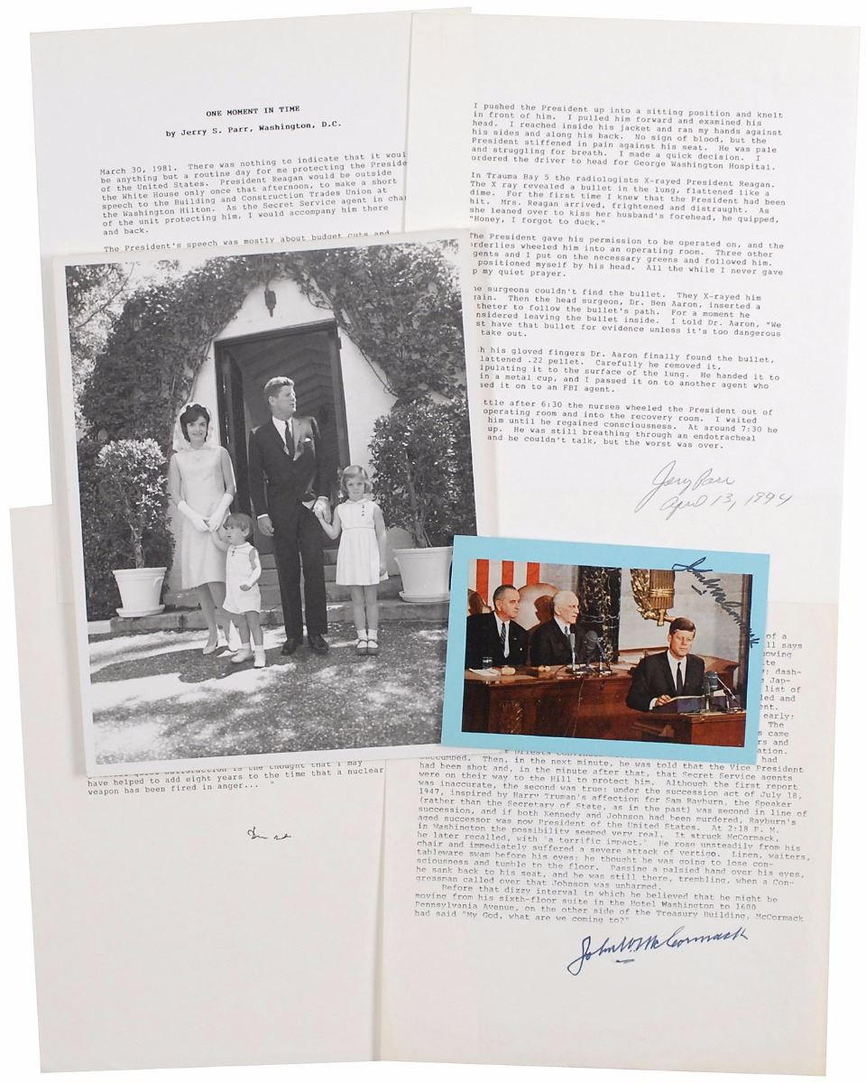 Five items: a one-page souvenir typescript on the Cuban Missile Crisis, signed by Dean Rusk; a color 6 x 4 photo of Kennedy giving a State of the Union address, signed in black felt tip by John McCormack; a one page souvenir typescript signed by McCormack recounting his experience on November 22, 1963; an original 1960s matte-finish 8 x 10 gelatin silver photo of John F. Kennedy and family outdoors on Easter Sunday; and a two-page souvenir typescript signed by Jerry S. Parr, recounting the assassination attempt on Ronald Reagan. In fine condition.