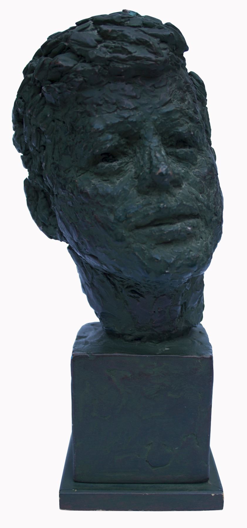John F. Kennedy bust sculpture by famed sculptor Robert Berks, who created a similar sculpture of Robert Kennedy. Sculpture is made of plaster and painted a dark green, mounted at an asymmetrical angle. Engraving on the back of the base reads ''A Presentation of / 65th Anniversary / Convention / I.L.G.W.U. / Miami Beach / May 1965'', indicating it was given at the International Ladies Garment Workers Union convention in 1965. Measures 8.75'' in height on a 3'' square base. Weighs 3 lbs. A few chips to top and side of head, else near fine.