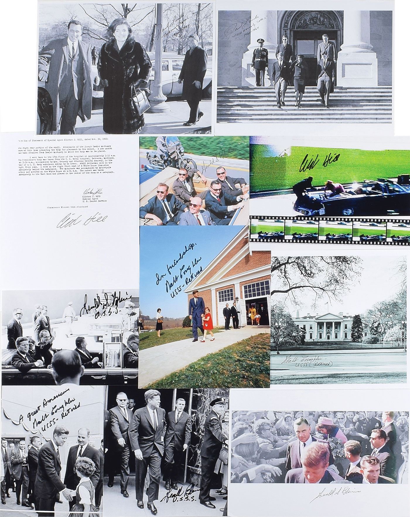 Collection of 11 items signed by a member of the Secret Service team present at the assassination of President John F. Kennedy, consisting almost entirely of signed photos, ranging in size from 8 x 10 to 11 x 8.5, with images showing the agent, members of the Kennedy family, and the White House. Subjects include: Gerald Blaine (4), Walt Coughlin (3), Clint Hill (SP and souvenir typescript), and Paul Landis (2). In overall fine to very fine condition.