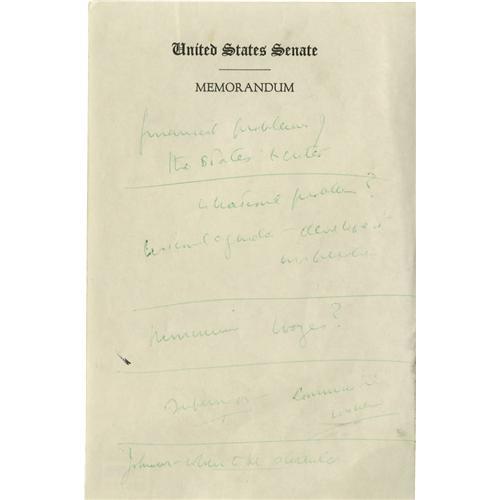 <B> John F. Kennedy Senate Notes. </B></I> One page, handwritten document, measuring 5.25" x 8", undated and unsigned. The content is routine for government hearings, and is written on United States Senate stationery. <BR><BR> The document is in fine condition; paper is slightly yellowing; localized soiling on the upper portion of the document. <BR><BR><B>Important notice:<