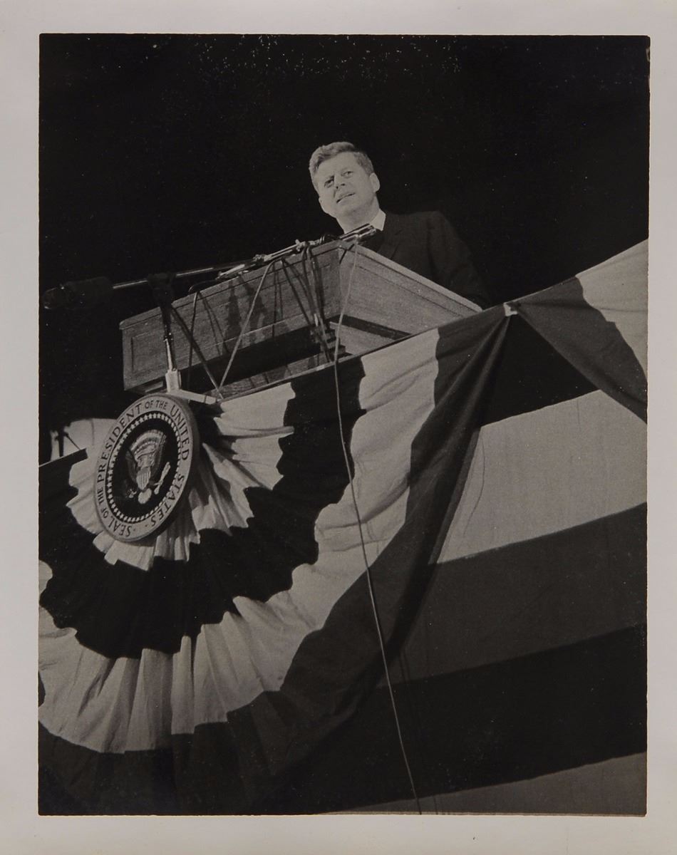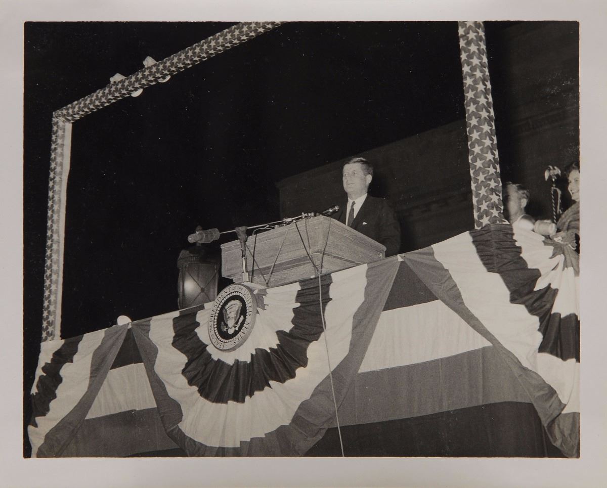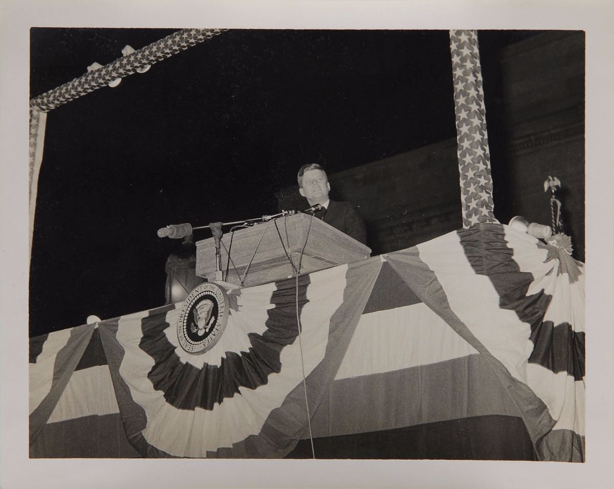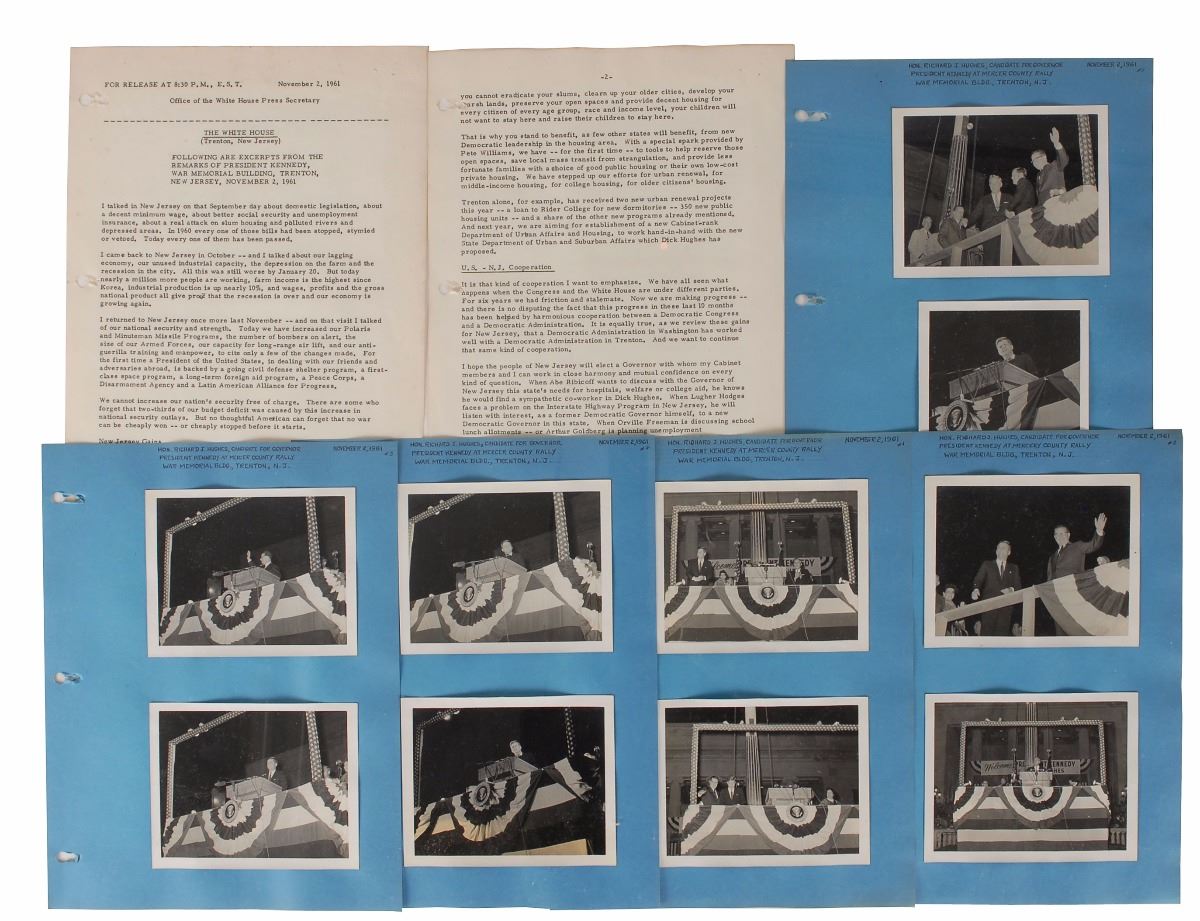Collection of ten original candid photos, 5 x 4 and 4 x 5, of an event in Trenton, New Jersey, on November 2, 1961, at which President Kennedy gave remarks on the cooperation between federal and local government to improve the state, with comments on jobs, Social Security, and housing. Kennedy is seen in eight of the images, with most showing him at the podium, and the others depict gubernatorial candidate Richard J. Hughes, who went on to be elected governor a month later. The photos are affixed to larger scrapbook pages. Includes an original two-page press release covering the event. In overall fine condition. A neat set of photos showing President Kennedy on the campaign trail for a fellow Democrat.