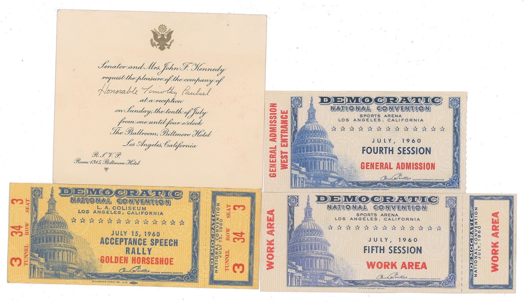 Two tickets and one ticket stub for the 1960 Democratic National Convention held at the Sports Arena in Los Angeles, California, during which John F. Kennedy was nominated for president, including: a 5.5 x 2.75 ‘general admission’ ticket stub for the fourth session; a 7 x 2.75 ‘work area’ ticket for the fifth session; and a yellow “Golden Horse” ticket for the “Acceptance Speech Rally” on July 15, 1960, issued as “Tunnel 3, Row 34, Seat 3.” Also included is an invitation from “Senator and Mrs. John F. Kennedy” requesting the presence of the “Honorable Timothy Paulsel” for a reception on July 10 [1960] at the Biltmore Hotel in Los Angeles. In overall fine condition.