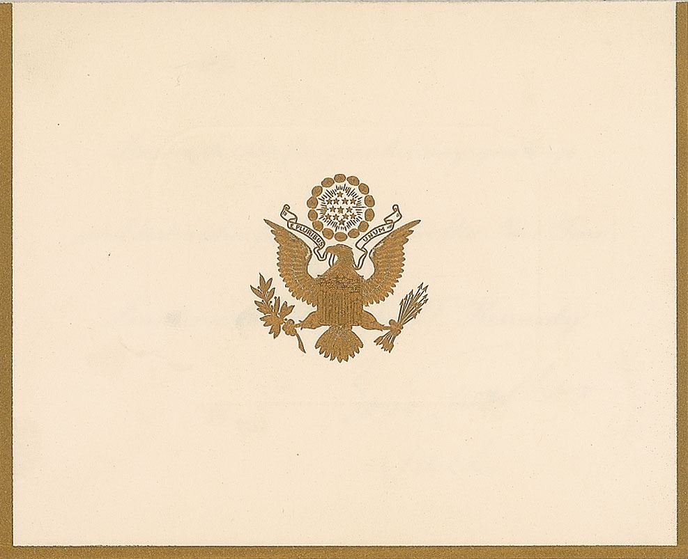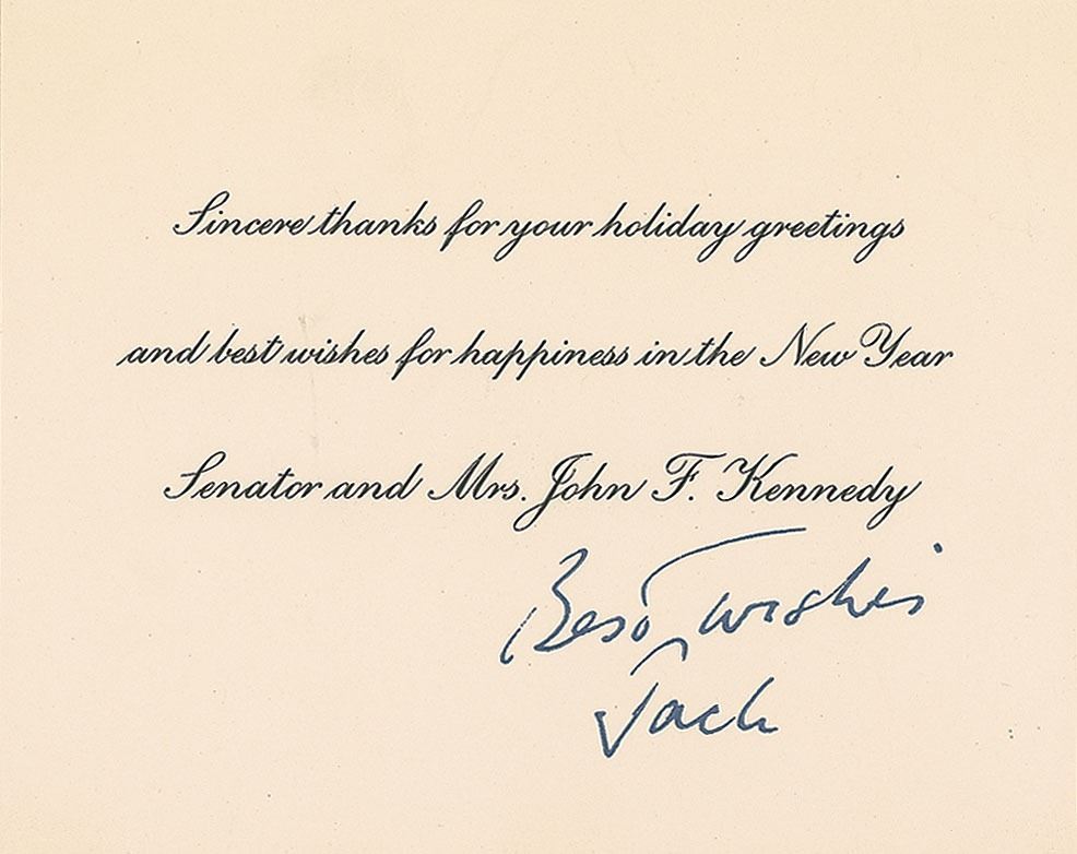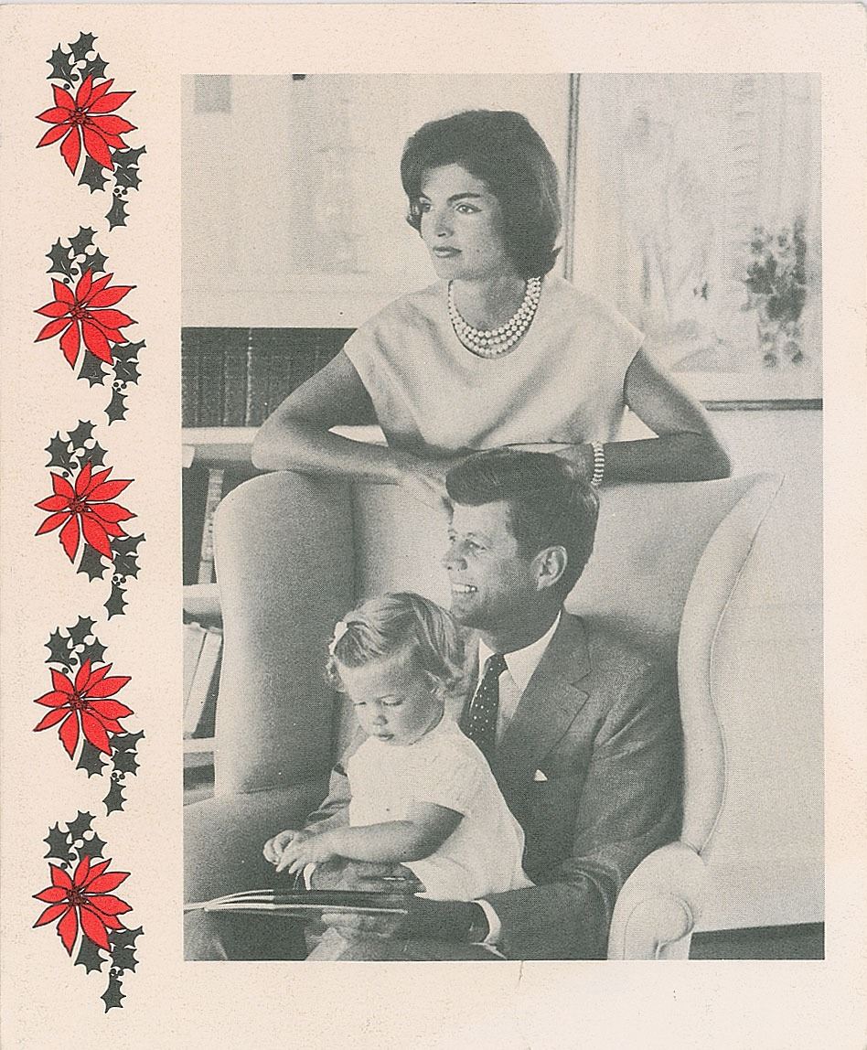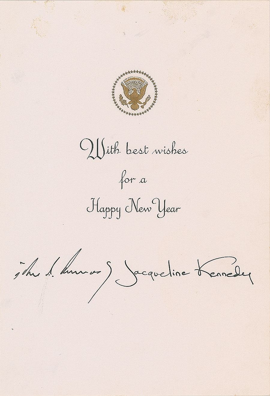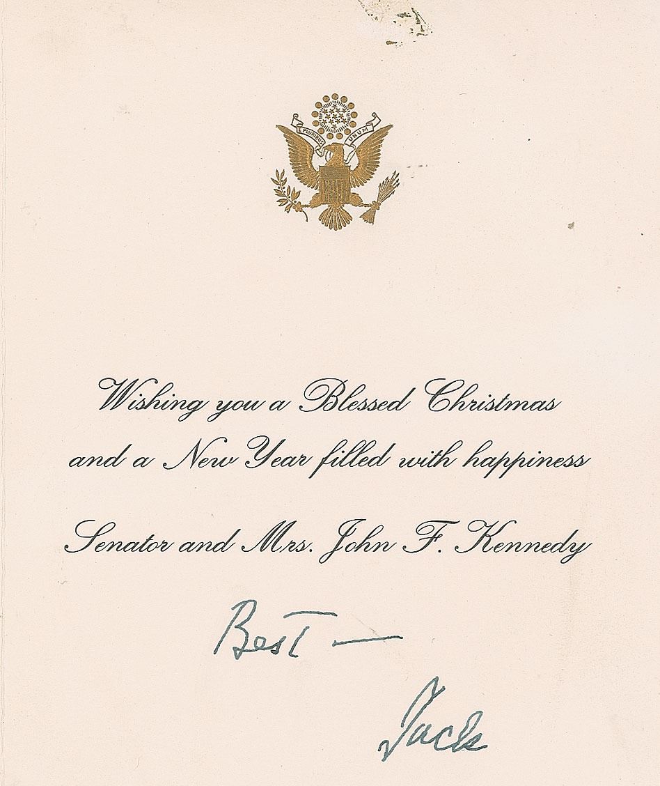 Group of three Christmas cards sent from the Kennedy family, including: a card from 1959 with front showing Senator Kennedy, his wife, and a young Caroline, and the inside bearing an autopen signature, “Best—Jack”; a card from 1960 with front showing a golden embossed Great Seal of the United States, with a secretarial signature, “Best wishes, Jack”; and a rare original unused 1963 presidential Christmas card, with a glossy color image of the Creche in the East Room on the front, and the inside featuring printed facsimile signatures of JFK and Jacqueline Kennedy below a gold embossed seal. Produced by Hallmark, these 1963 cards were printed and delivered to the White House in November 1963, prior to the assassination. In overall very good to fine condition.