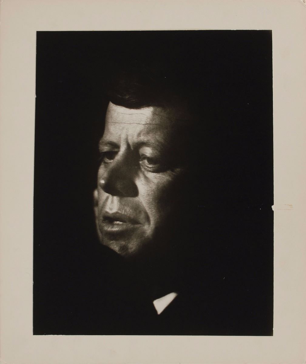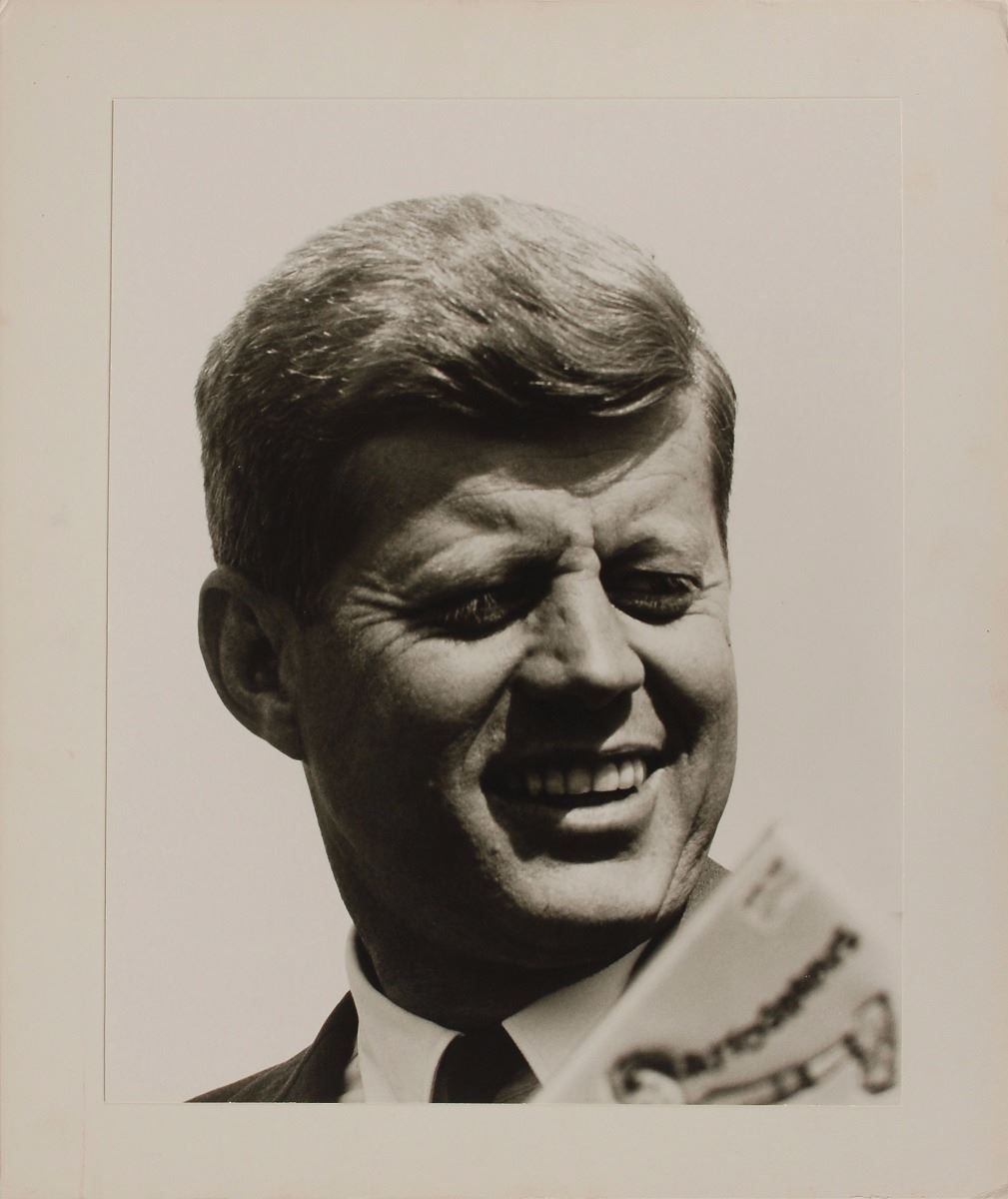 Collection of three original matte-finish photos of JFK, 10.5 x 13.5 and 13.5 x 10.5, all affixed to their original mounts bearing Leigh Wiener photographer’s stamps on the reverse. Images include a close-up of Kennedy smiling and two of him in quite serious poses. In overall fine condition.