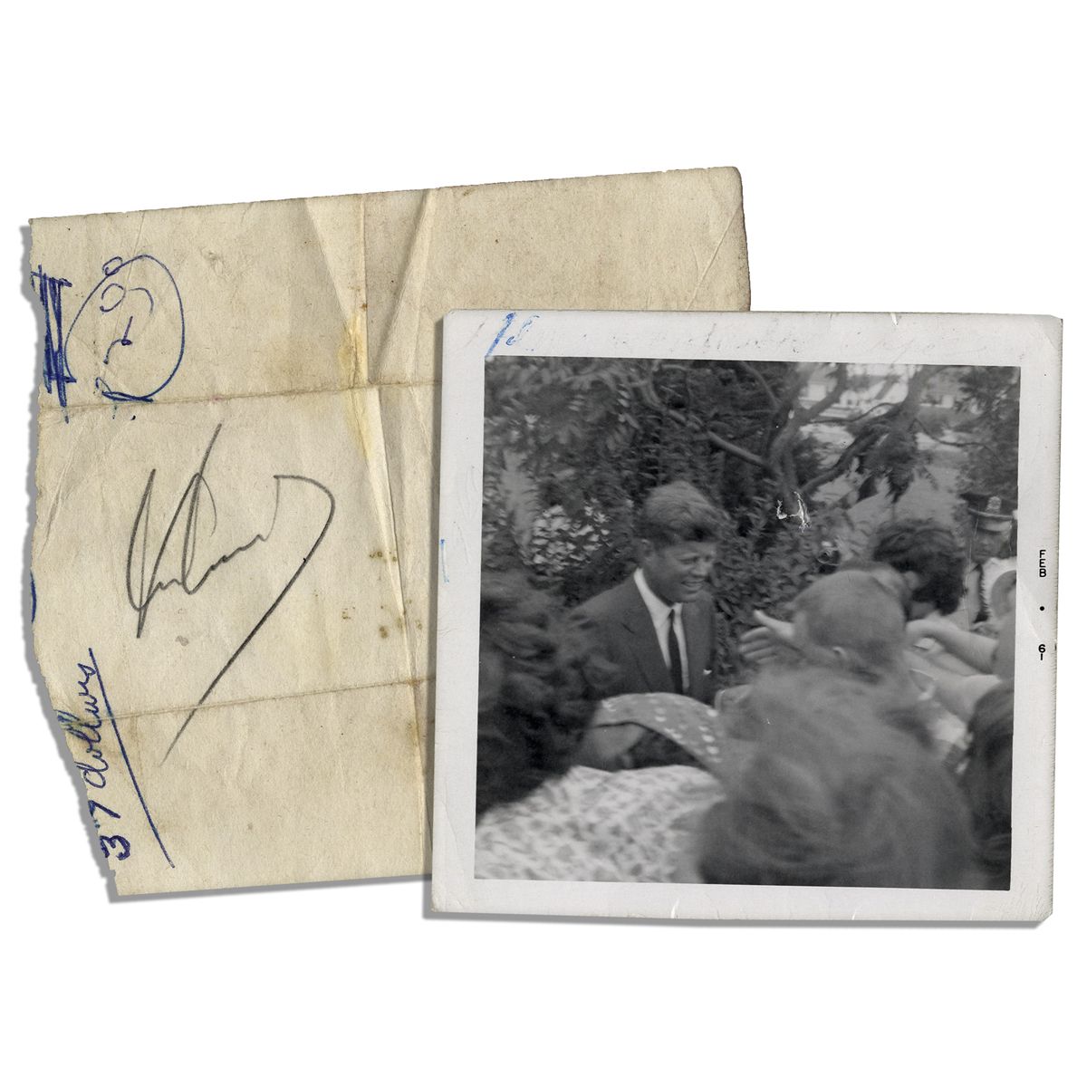 John F. Kennedy signature as President and snapshot taken by the autograph seeker. Slip is signed ''John Kennedy'' in pencil. Photo is of Kennedy greeting a crowd as President, with date imprinted to the right edge as February of 1961. Signed slip measures 4.25'' x 3.25''. Toning, creasing, an irregular left edge and ink notations. Very good. Photo measures 3.5'' square. Pinhole and surrounding small closed tear to upper portion, not affecting Kennedy's image, and ink note to upper border, else near fine. With PSA/DNA COA.