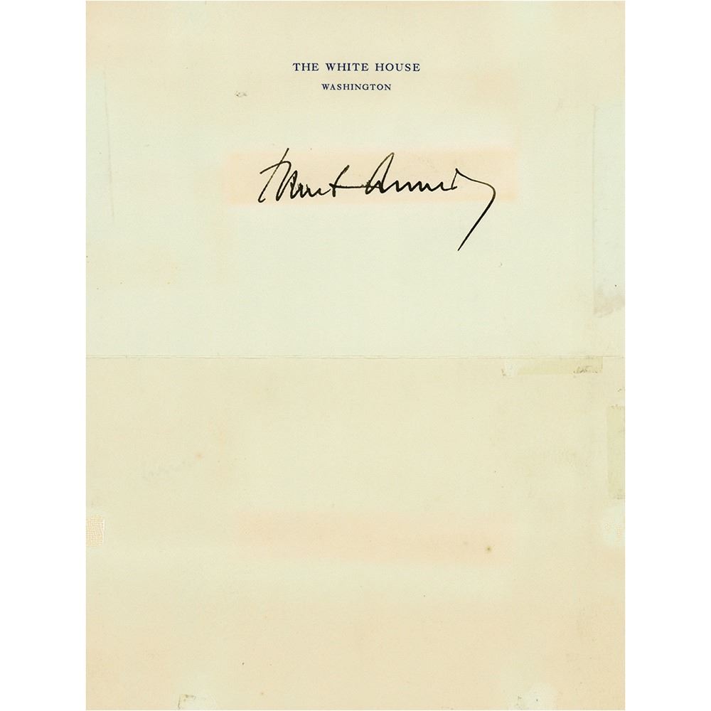 Desirable fountain pen signature as president, "John F. Kennedy,†on an off-white 6.75 x 8.75 sheet of blank official White House letterhead. In very good to fine condition, with old tape stains along the edges, and toning from prior display.