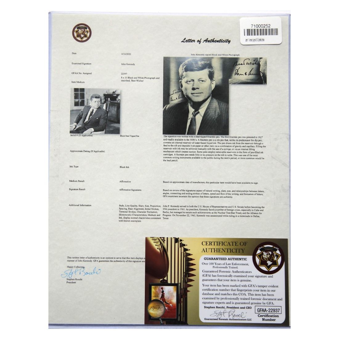 John Kennedy (May 29, 1917 – November 22, 1963) signed black and white photograph. Signatures is in black ink and inscribed, ‘Best Wishes.’ John F. Kennedy served in both the U.S. House of Representatives and U.S. Senate before becoming the 35th president in 1961. As president, Kennedy faced a number of foreign crises, especially in Cuba and Berlin, but managed to secure such achievements as the Nuclear Test-Ban Treaty and the Alliance for Progress. On November 22, 1963, Kennedy was assassinated while riding in a motorcade in Dallas, Texas. This item has been professionally custom matted and framed. Comes with a Letter of Authentication from Guaranteed Forensic Authenticators, along with the GFA guarantee of authenticity.