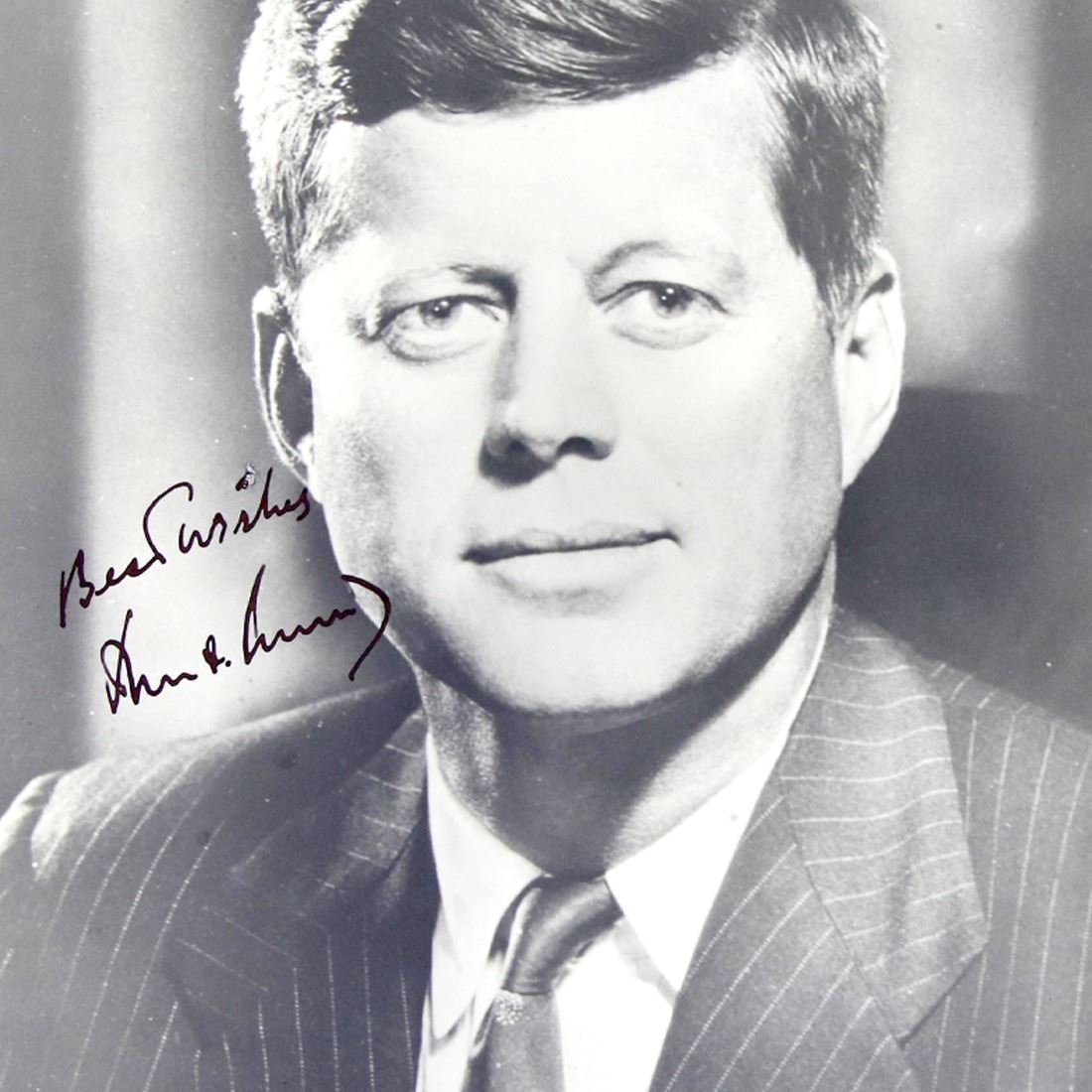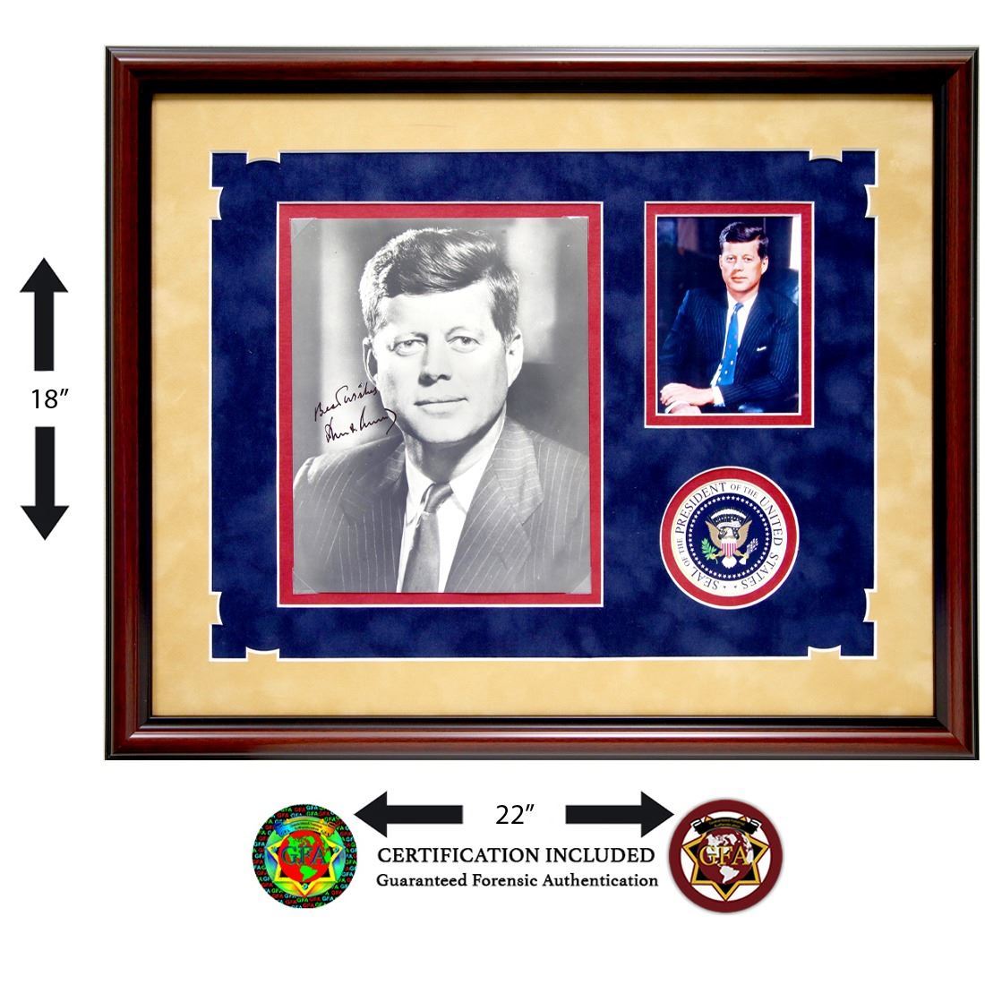 John Kennedy (May 29, 1917 – November 22, 1963) signed black and white photograph. Signatures is in black ink and inscribed, ‘Best Wishes.’ John F. Kennedy served in both the U.S. House of Representatives and U.S. Senate before becoming the 35th president in 1961. As president, Kennedy faced a number of foreign crises, especially in Cuba and Berlin, but managed to secure such achievements as the Nuclear Test-Ban Treaty and the Alliance for Progress. On November 22, 1963, Kennedy was assassinated while riding in a motorcade in Dallas, Texas. This item has been professionally custom matted and framed. Comes with a Letter of Authentication from Guaranteed Forensic Authenticators, along with the GFA guarantee of authenticity.