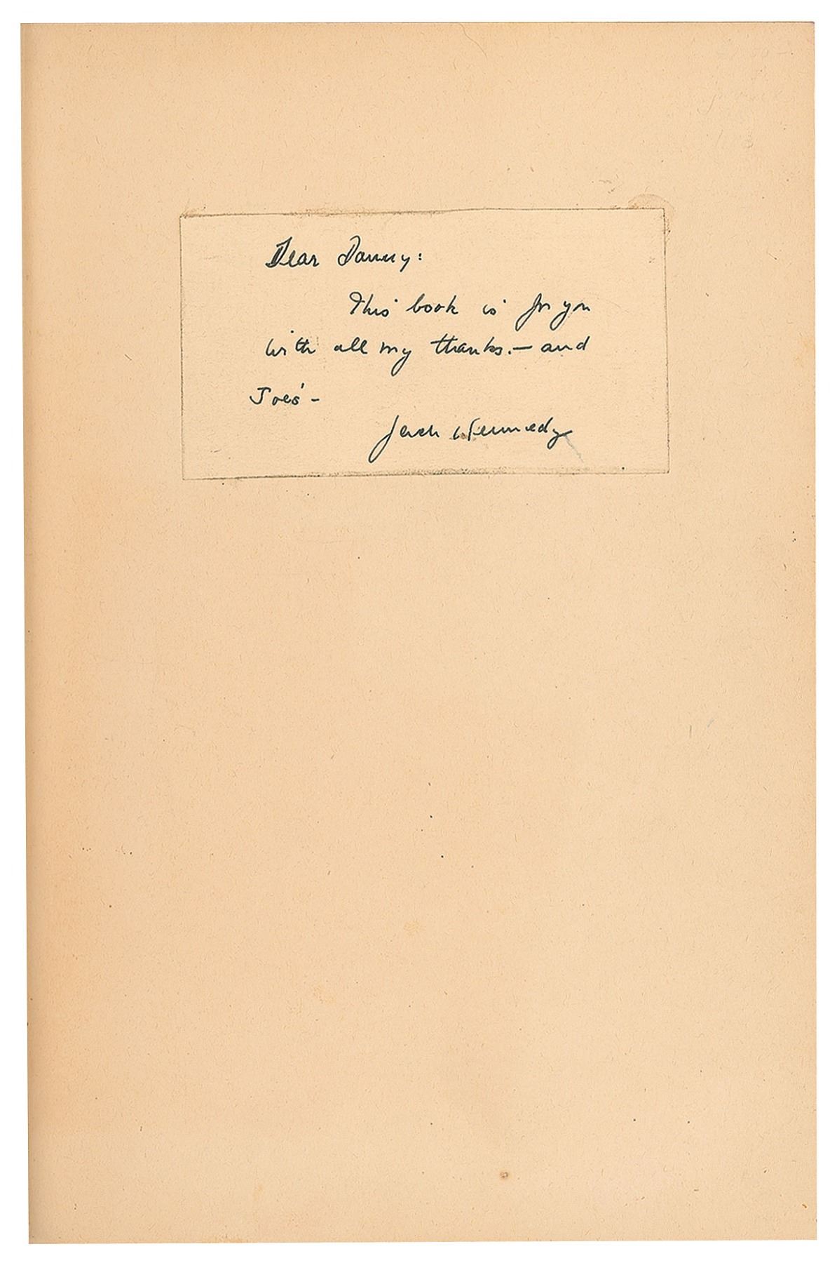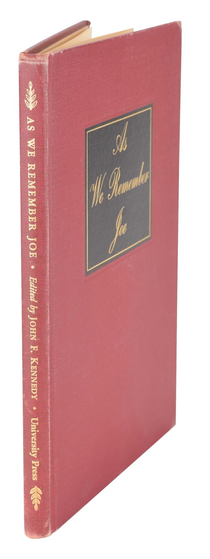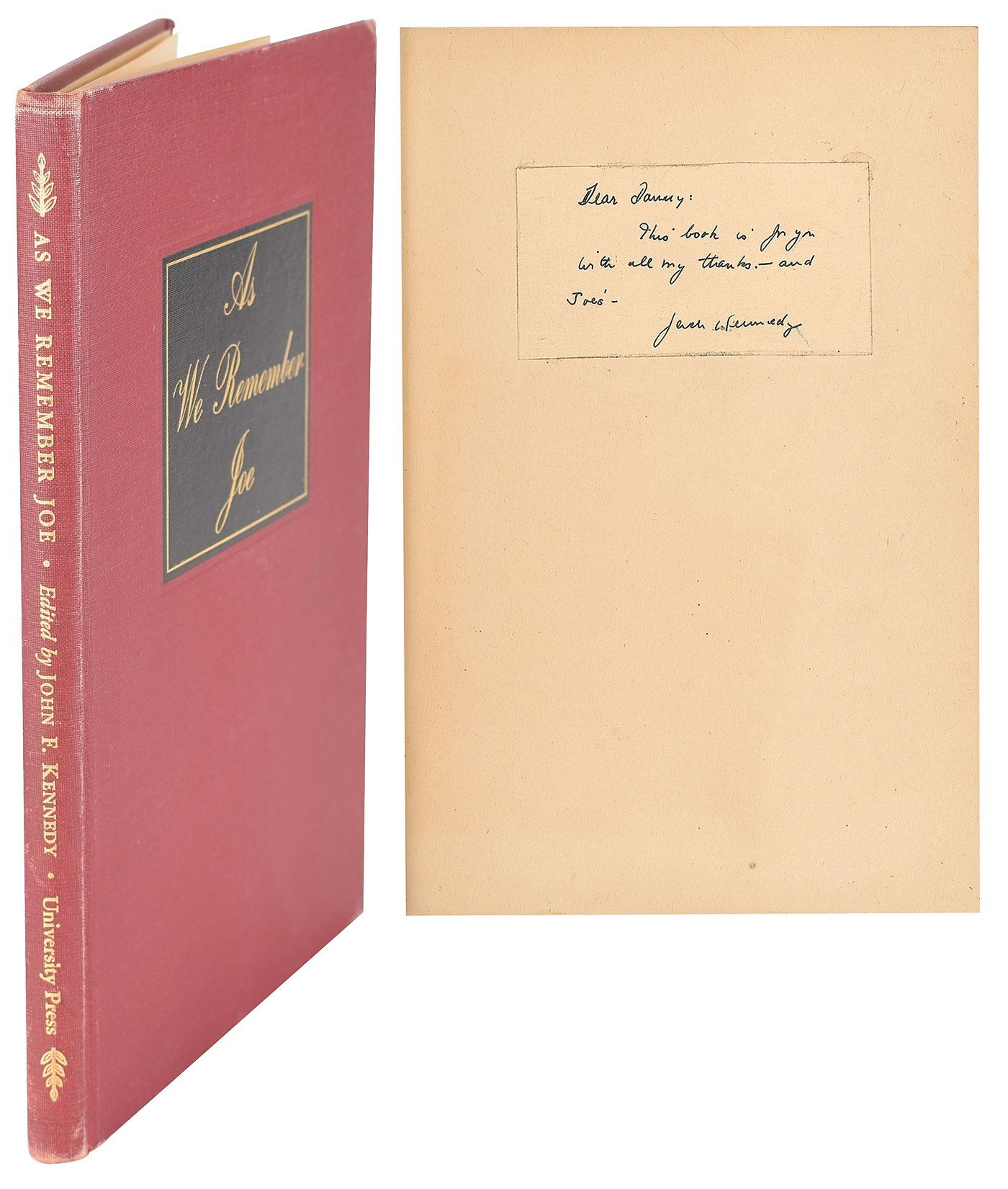 Rare signed book: As We Remember Joe. Privately printed in an edition of 250. Cambridge, Massachusetts: University Press, 1945. Hardcover bound in red cloth with gilt lettering, 6.25 x 9.25, 75 pages. Signed and inscribed on a card affixed to the first free end page in fountain pen, "Dear Danny: This book is for you with all my thanks—and Joe's—Jack Kennedy." Autographic condition: fine to very fine. Book condition: VG/None, with minor edgewear, bumped corners, and a "Library of Lawrence E. Miller" blindstamp to a rear page.