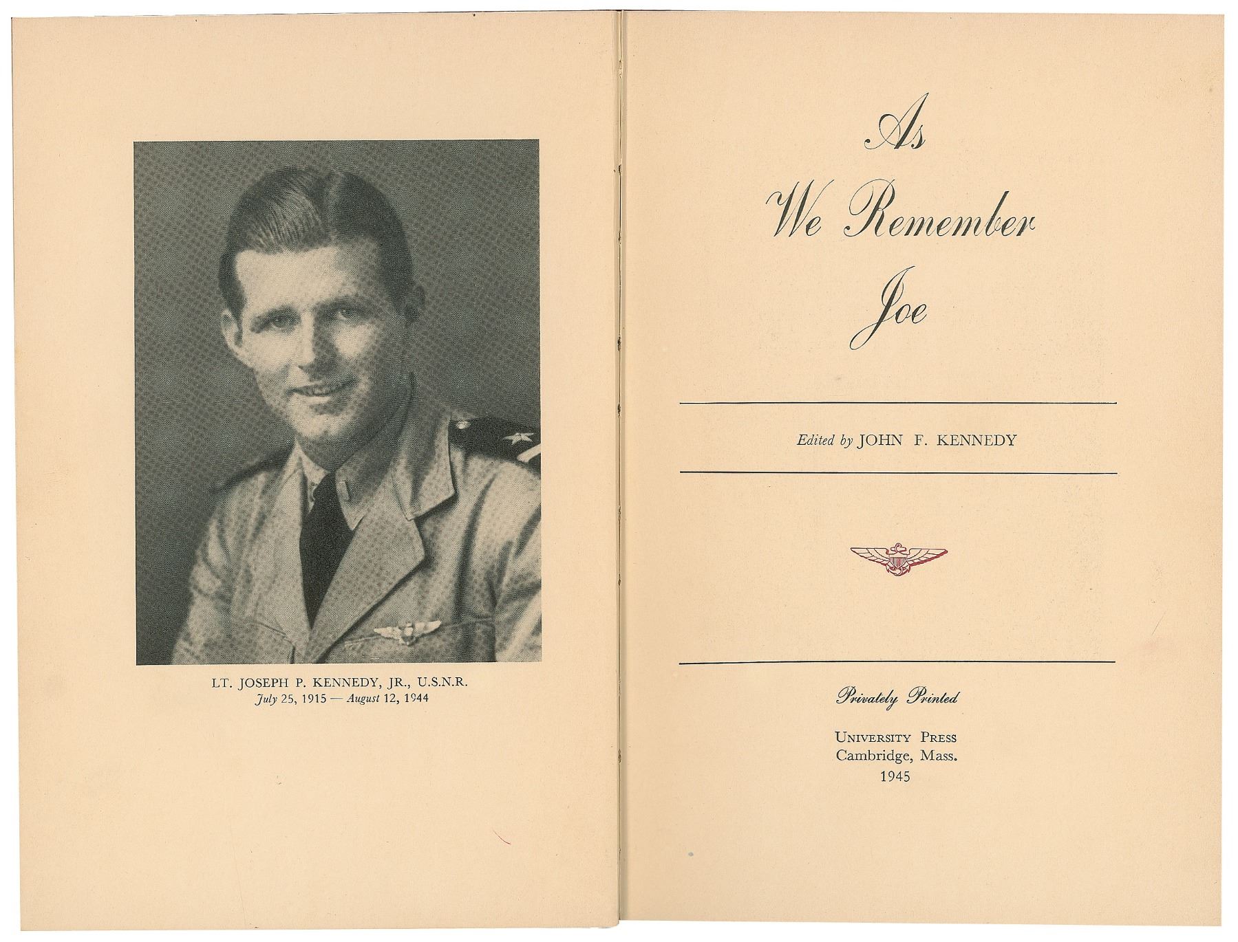 In August 1944, Joseph P. Kennedy, Jr., was killed in action during World War II when his plane exploded over England. Hoping to honor his brother, JFK solicited contributions of the reminiscences of family and friends of Joseph P. Kennedy, Jr., collected and published as a 1945 Christmas gift for members of the Kennedy family and Joe's close friends. In his foreword, Kennedy excuses those who might not have contributed because they 'are at this time fighting around the globe—or have, like Joe, died.' A highly sought-after book, boasting an early signature from John F. Kennedy, presumably presenting the rare volume to one of his elder brother's friends.