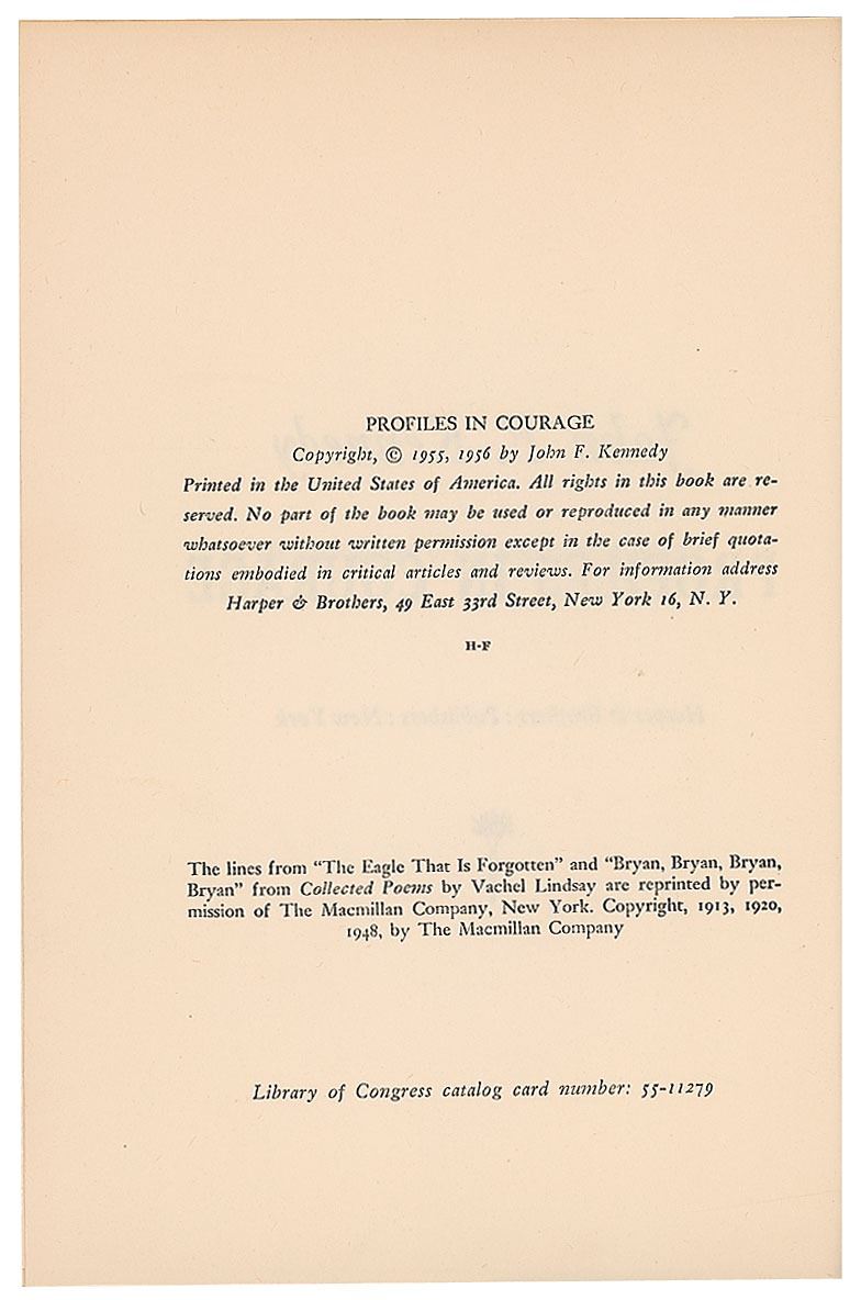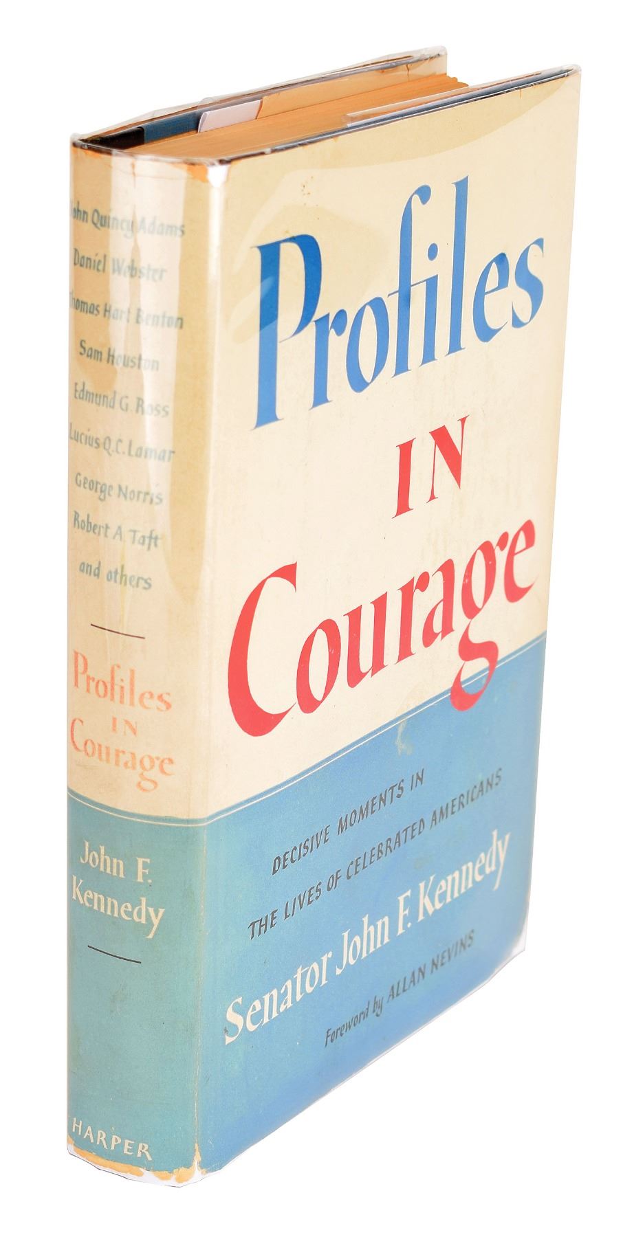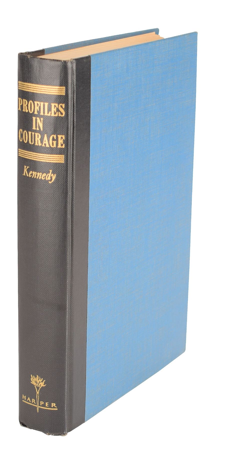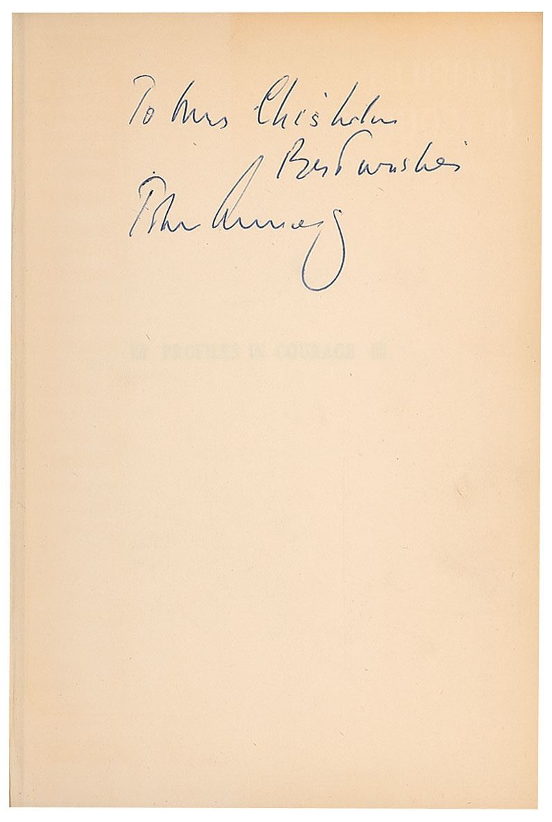 Signed book: Profiles in Courage. Later printing. NY: Harper & Brothers, 1956. Hardcover with dust jacket, 6 x 8.5, 266 pages. Signed and inscribed on the first free end page in blue ballpoint, "To Mrs. Chisholm, Best wishes, John Kennedy." Autographic condition: fine. Book condition: VG+/VG, with a few small edge tears to the jacket.