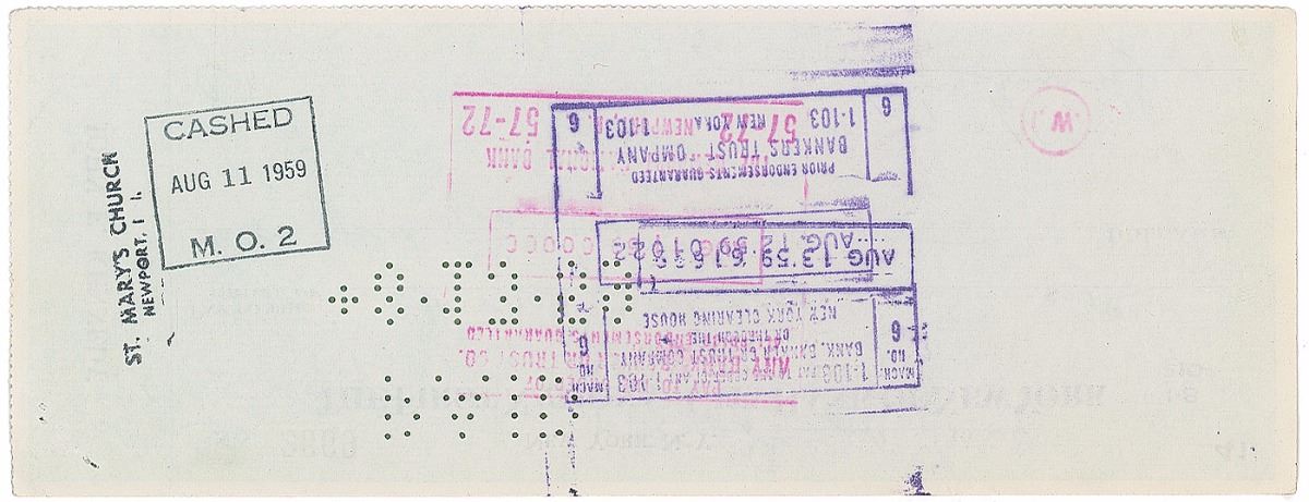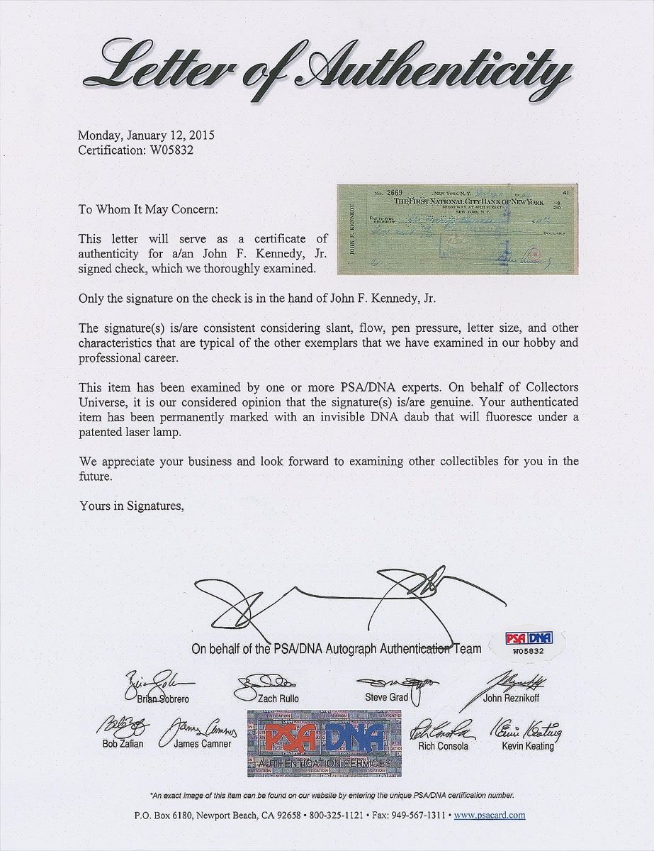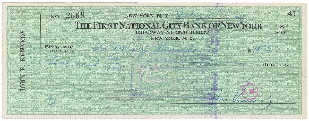 Scarce personal check, 8.5 x 3.25, filled out in another hand and signed by Kennedy, “John Kennedy,” payable to St. Mary’s Church for $10, July 11, 1959. In fine condition, with expected cancellation marks touching portions of signature. Accompanied by a full letter of authenticity from PSA/DNA. John and Jacqueline married at historic St. Mary’s Church in Newport, Rhode Island, on September 12, 1953. The much-publicized wedding featured a massive guest list that included senators and congressmen, Bay State political figures, and several Hollywood luminaries, with the nuptial mass conducted by Cardinal Cushing, the esteemed Archbishop of Boston. An ideal check signed by Kennedy as the adored Massachusetts senator.