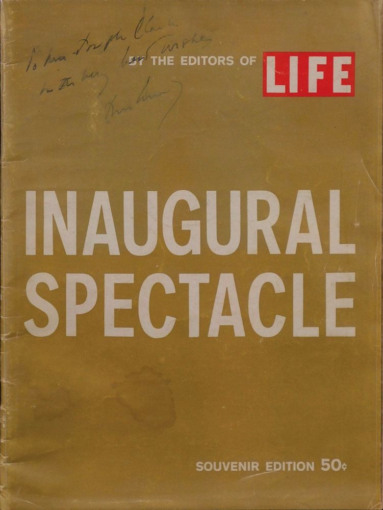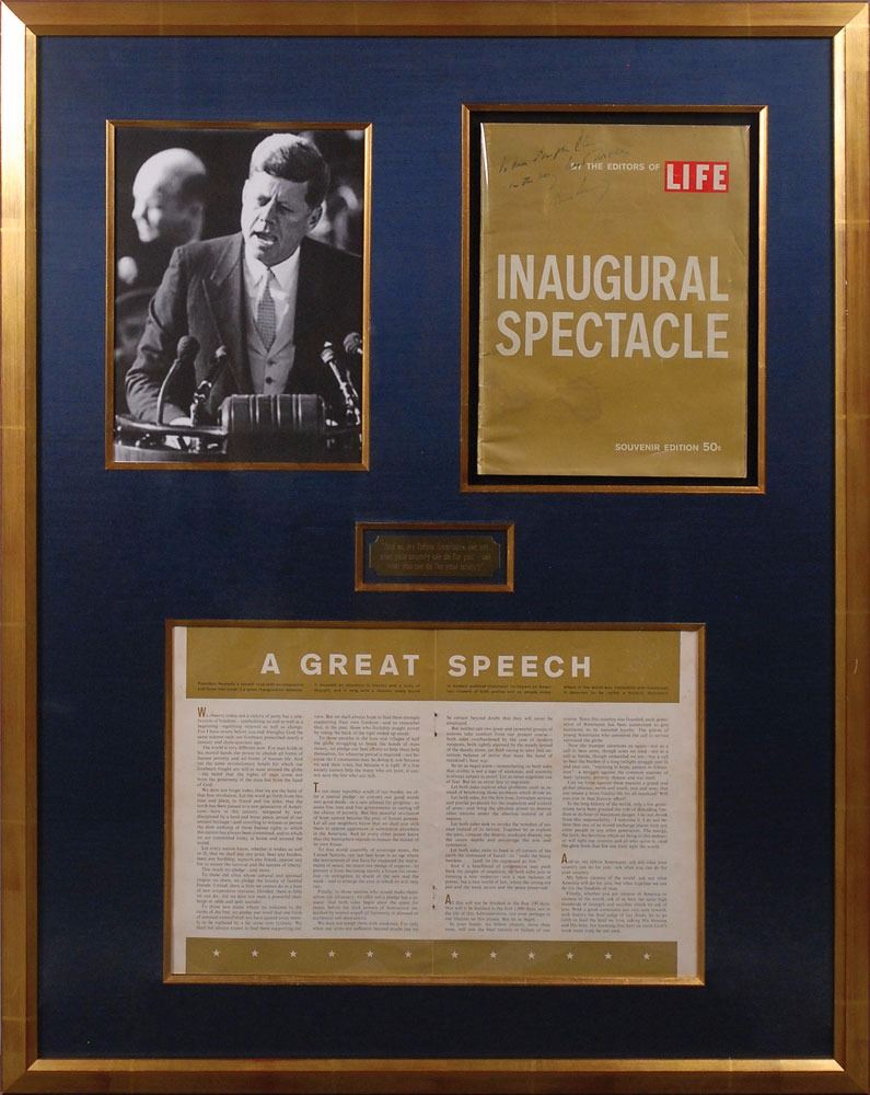 Vintage cover of Life magazine’s souvenir edition commemorating Kennedy’s inauguration, 8.25 x 11, signed and inscribed on the front cover in black ink, “For Mr. Joseph Clark with very best wishes, John Kennedy.” Cloth-matted and framed with the entire printed text of Kennedy’s inaugural speech, taken from inside the magazine, a portrait of Kennedy giving his speech, and a plaque bearing his famous quote from the closing of the speech to an overall size of 27 x 34. In very good condition, with some irregular ink adhesion and brushing to portions of inscription, Kennedy’s signature light, but legible, and some dampstaining to cover. Accompanied by a full letter of authenticity from PSA/DNA.