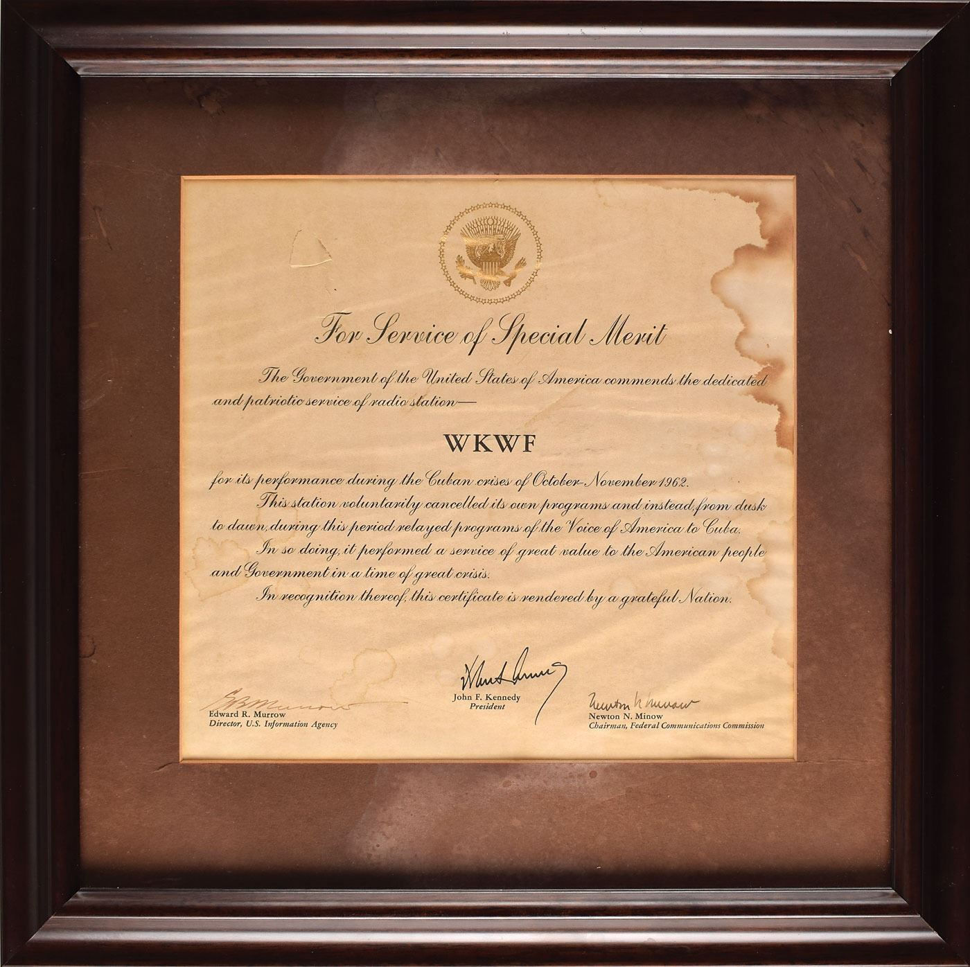 Scarce DS as president, one page, 11 x 10.5, no date but circa 1962–63. An award certificate to a Key West radio station for its service during the Cuban Missile Crisis, in full: "For Service of Special Merit, The Government of the United States of America commends the dedicated and patriotic service of radio station—WKWF for its performance during the Cuban crises of October–November 1963. This station voluntarily cancelled its own programs and instead, from dusk to dawn, during this period relayed programs of the Voice of America to Cuba. In so doing, it performed a service of great value to the American people and Government in a time of great crisis. In recognition thereof, this certificate is rendered by a grateful Nation." Signed at the conclusion by President John F. Kennedy, US Information Agency Director Edward R. Murrow, and FCC Chairman Newton N. Minow. Matted and framed to an overall size of 17.5 x 17.5. In very good condition, with creasing, a tear to the upper left blank area, and overall dampstaining to both the document and the mat; Kennedy's bold signature is completely unaffected.