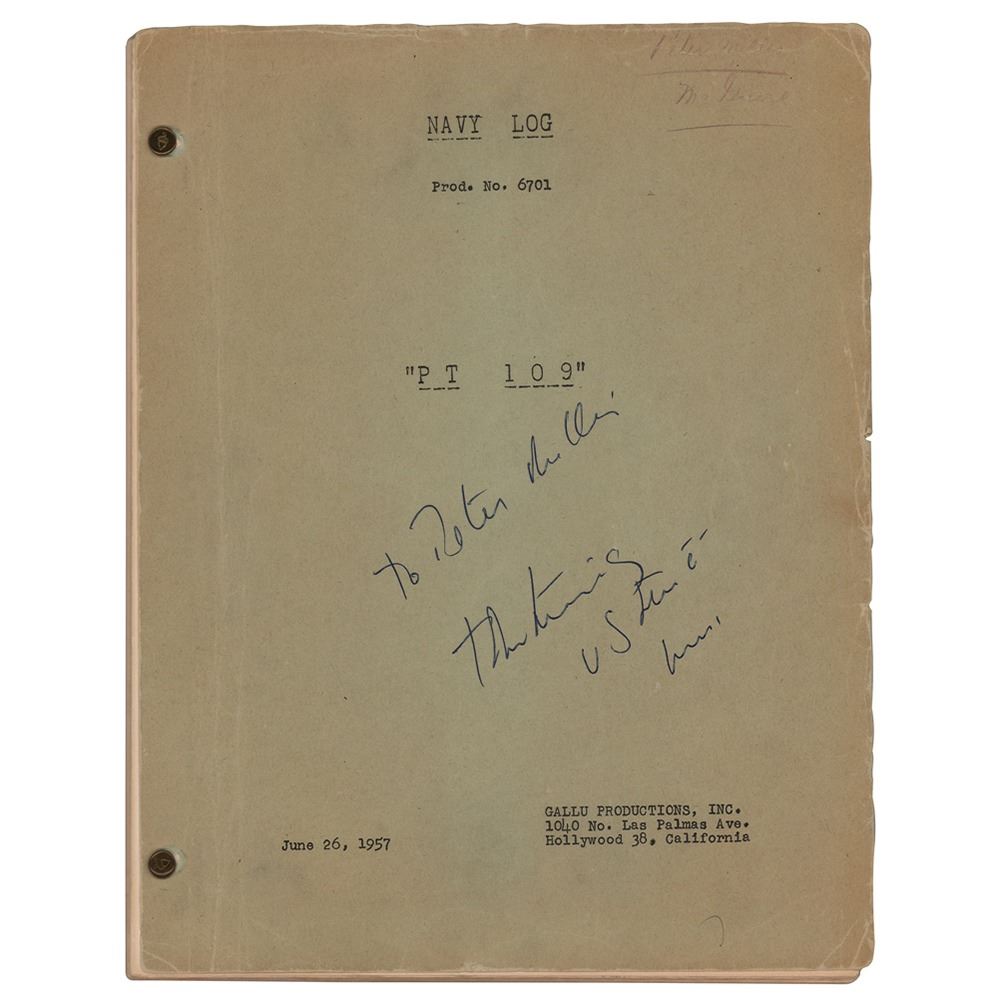 Original brad-bound shooting script for the "PT 109" episode of the television series Navy Log, June 26, 1957, prod. no. 6701, 8.5 x 11, 50 pages, signed and inscribed on the front cover in blue ballpoint to one of the show's actors, "To Peter Miller, John Kennedy, US Senator, Mass." Miller played the role of 'McQuire' in this episode (for real-life radioman John McQuire), and his lines are circled throughout the script. In fine condition, with light edgewear and toning. The CBS television series Navy Log related the greatest survival war stories in the history of the United States Navy, running for three seasons 1955–1958; this episode told the story of the destruction of PT-109 and John F. Kennedy's valiant leadership in its aftermath. A rare script associated with Kennedy's PT-109 heroics, signed during his time in the Senate.