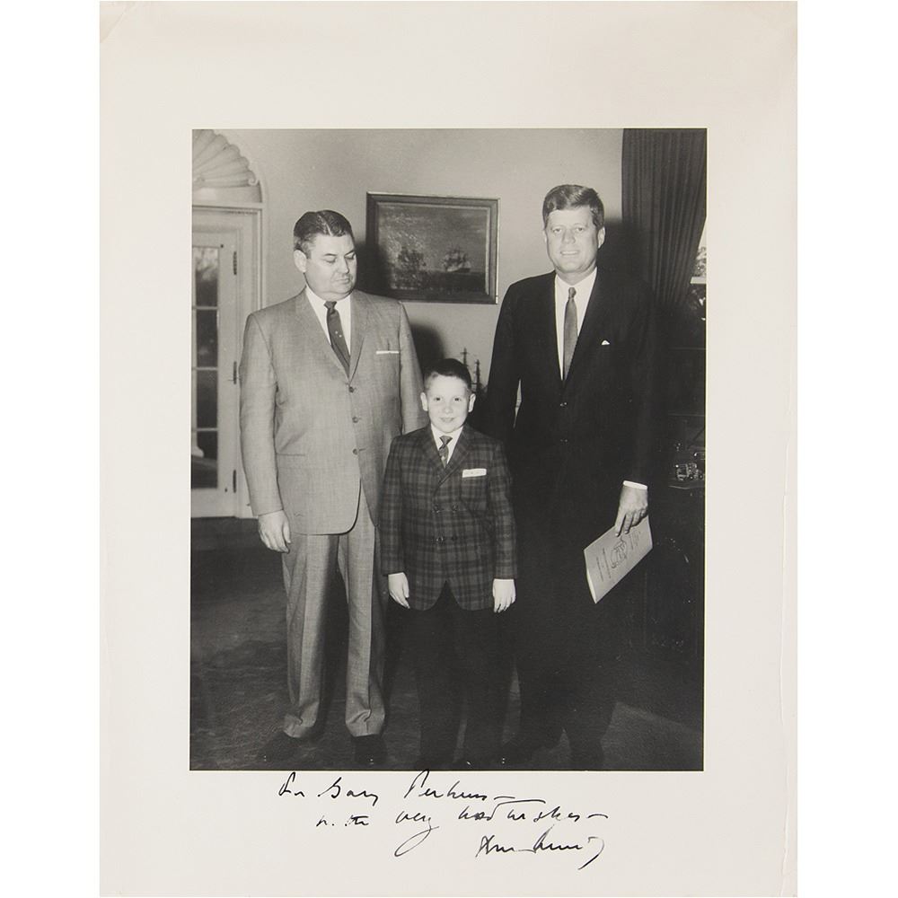 Very appealing matte-finish 10.75 x 14 photo of President John F. Kennedy standing in the White House next to William and Gary Perkins, father and son, the latter the photo's young recipient, signed and inscribed in the lower border in fountain pen, "For Gary Perkins, with very best wishes, John Kennedy.†In very good to fine condition, with creasing, primarily to the edges and corners, and easily matted out. Accompanied by a letter of authenticity from JSA. A handsome front-facing portrait of JFK.